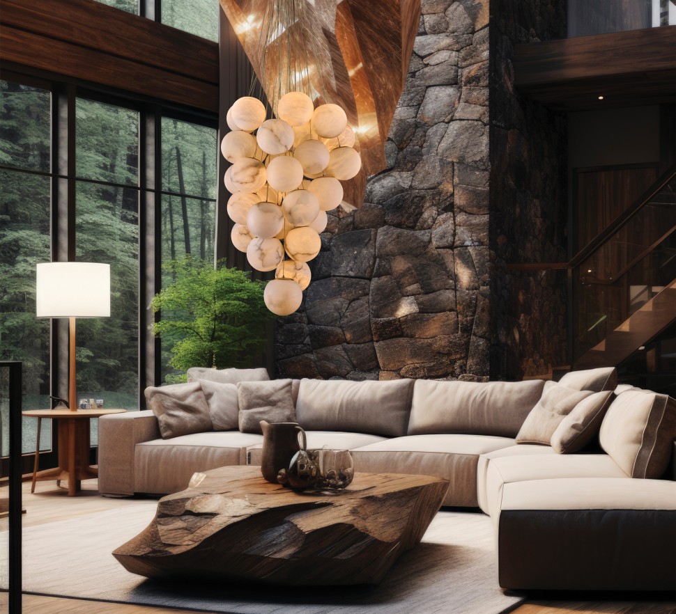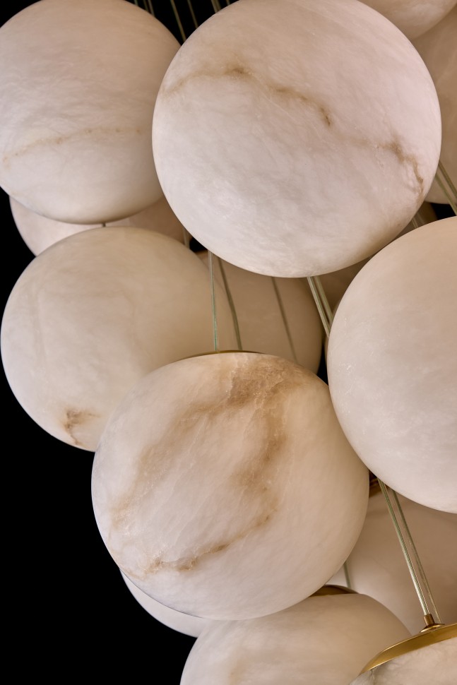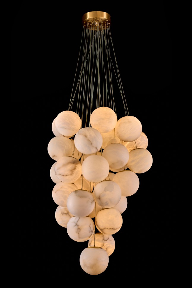 Плафоны выполнены из натурального камня - испанского алебастра. Корпус – из металла с гальваническим покрытием цвета латуни.