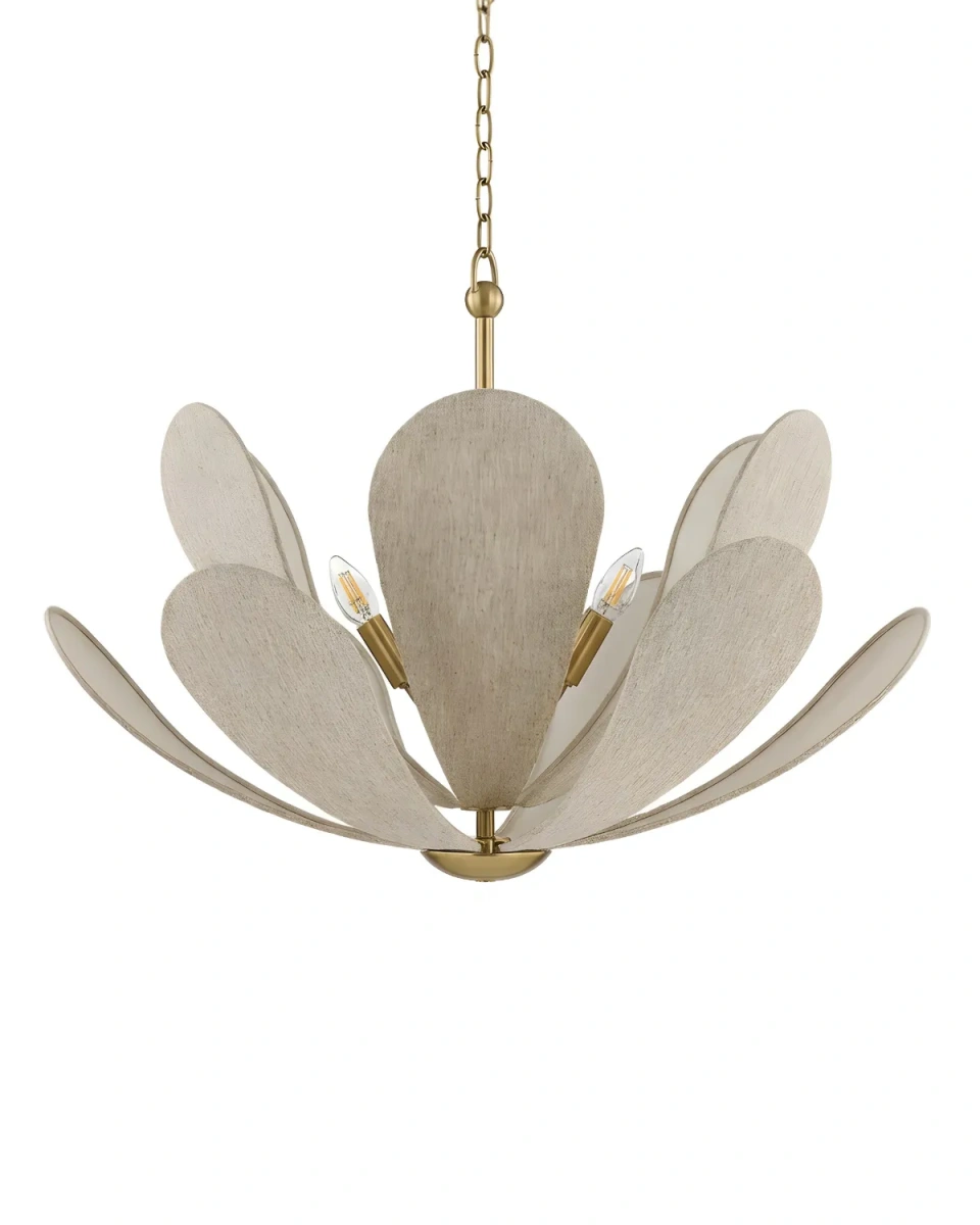 Золотистая люстра "Флэк" с бежевым абажуром - это выразительный дизайнерский светильник, вдохновлённый природными формами и современной американской эстетикой. Мягкие куполообразные элементы из льняной ткани образуют воздушную композицию, напоминающую лепестки, и создают тёплую, уютную атмосферу в интерьере. Корпус из металла с гальваническим покрытием в оттенке брашированной латуни добавляет люстре благородства и элегантного блеска. Размер люстры составляет 57 см в высоту и 74,5 см в диаметре, а регулируемая общая высота от 59,7 до 192,5 см позволяет использовать её как в помещениях со стандартными, так и с высокими потолками. Подвес выполнен на цепи длиной 130 см с возможностью регулировки — длина одного звена составляет 4 см, что обеспечивает необходимуую настройку высоты. Светильник рассчитан на шесть ламп с цоколем E27 мощностью до 40 Вт каждая, что позволяет добиться мягкого, равномерного освещения. Модель «Флэк» гармонично впишется в интерьеры в стиле американский современный, contemporary, modern classic, а также в светлые эклектичные и природно-ориентированные пространства. Она станет эффектным акцентом в гостиной, столовой, спальне или зоне с высоким потолком, добавляя интерьеру ощущение уюта, мягкости и дизайнерской завершённости.