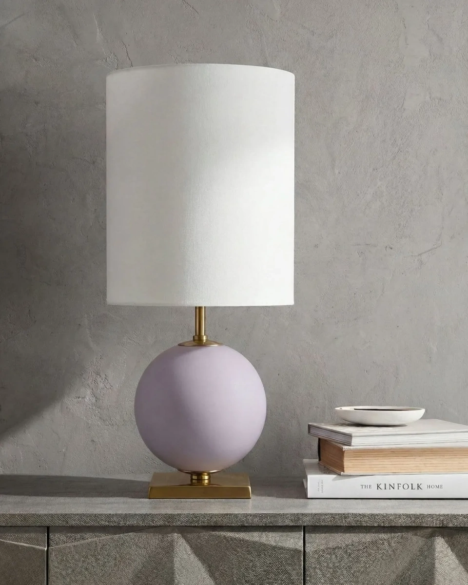 Лиловая настольная лампа "Иветт" - М - это акцент в интерьере, который благодаря своему лаконичному виду, идеально будет смотреться как в строгом кабинете, так и в нежной спальне в стиле неоклассики. Высокий цилиндрический абажур из натурального льна кремового оттенка мягко рассеивает свет, который мгновенно наполняет пространство уютом. Золотые элементы играют роль изысканной оправы, которая превращает лаконичную стеклянную сферу в настоящее интерьерное украшение.