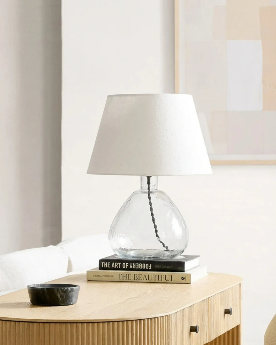 Прозрачная настольная лампа "Дэми" с чёрным проводом - это изящный акцент, который придаёт интерьеру лёгкость и свежесть. Прозрачная стеклянная лампа мягко отражает свет и окружающую обстановку, создавая ощущение воздушности. Верх украшен конусообразным льняным абажуром, который равномерно рассеивает свет, наполняя пространство мягким и уютным освещением. Абажур придаёт лампе современный и элегантный вид, делая её идеальным дополнением для прикроватной тумбы, консоли или рабочего стола. Прозрачное стекло в сочетании с натуральной текстурой льна гармонично вписывается в современные, минималистичные и скандинавские интерьеры, добавляя комнате изысканности и визуальной лёгкости.