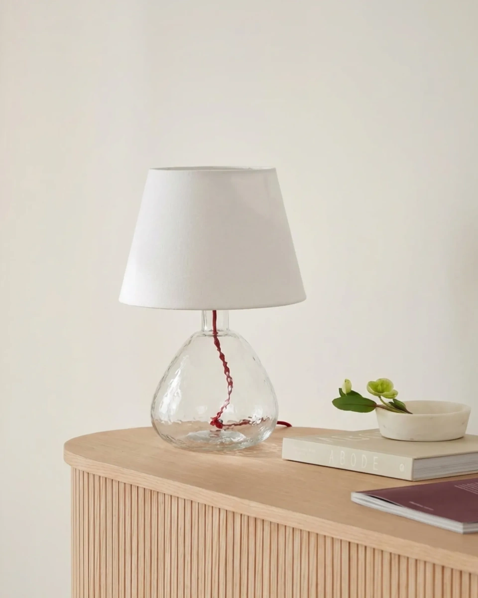 Прозрачная настольная лампа "Дэми" с красным проводом - это изящный акцент, который придаёт интерьеру лёгкость и свежесть. Прозрачная стеклянная лампа мягко отражает свет и окружающую обстановку, создавая ощущение воздушности. Верх украшен конусообразным льняным абажуром, который равномерно рассеивает свет, наполняя пространство мягким и уютным освещением. Абажур придаёт лампе современный и элегантный вид, делая её идеальным дополнением для прикроватной тумбы, консоли или рабочего стола. Красный провод добавляет яркий акцент, подчеркивая современный стиль лампы. Прозрачное стекло в сочетании с натуральной текстурой льна гармонично вписывается в современные, минималистичные и скандинавские интерьеры, добавляя комнате изысканности и визуальной лёгкости.
