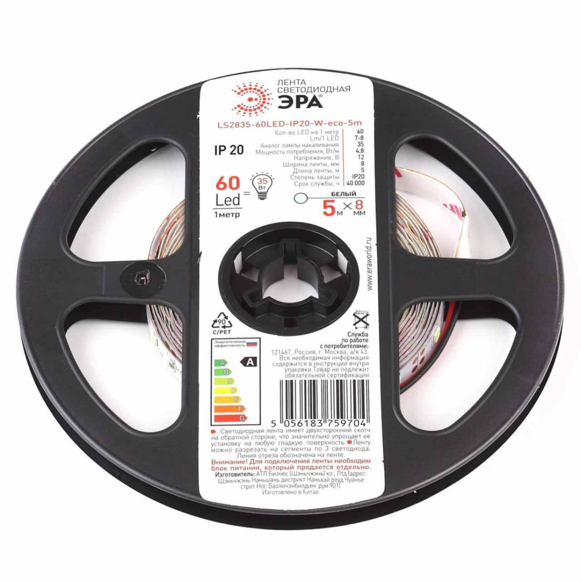 Светодиодная лента ЭРА 4,8W/m 60LED/m 2835SMD белый 5M LS2835-60LED-IP20-W-eco-5m Б0035586