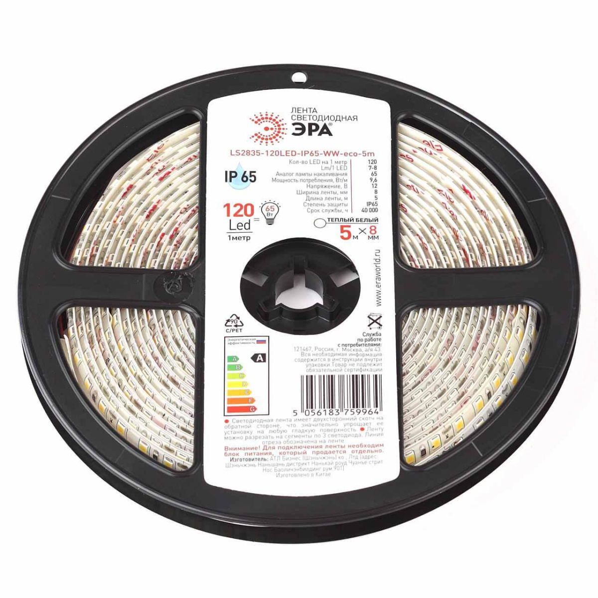 Светодиодная влагозащищенная лента ЭРА 9,6W/m 120LED/m 2835SMD теплый белый 5M LS2835-120LED-IP65-WW-eco-5m Б0035600