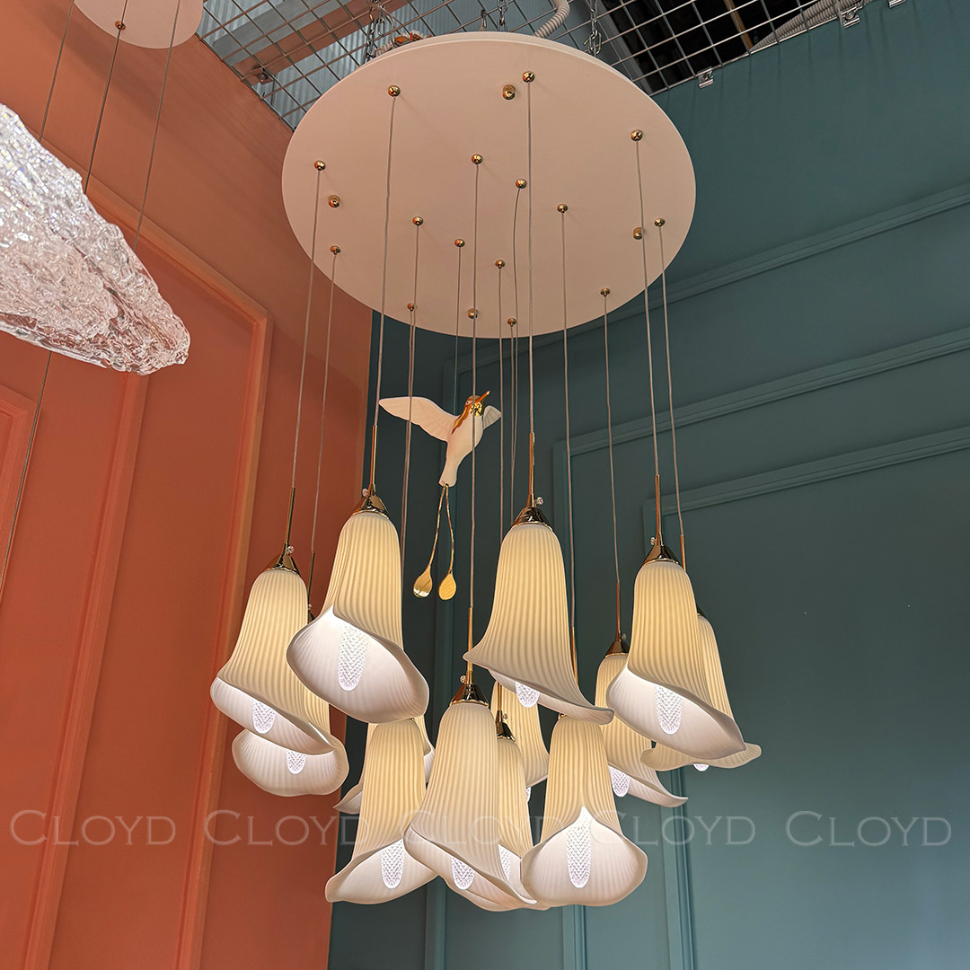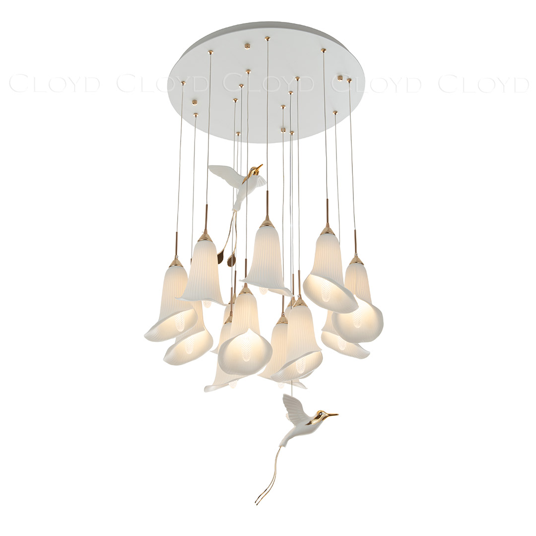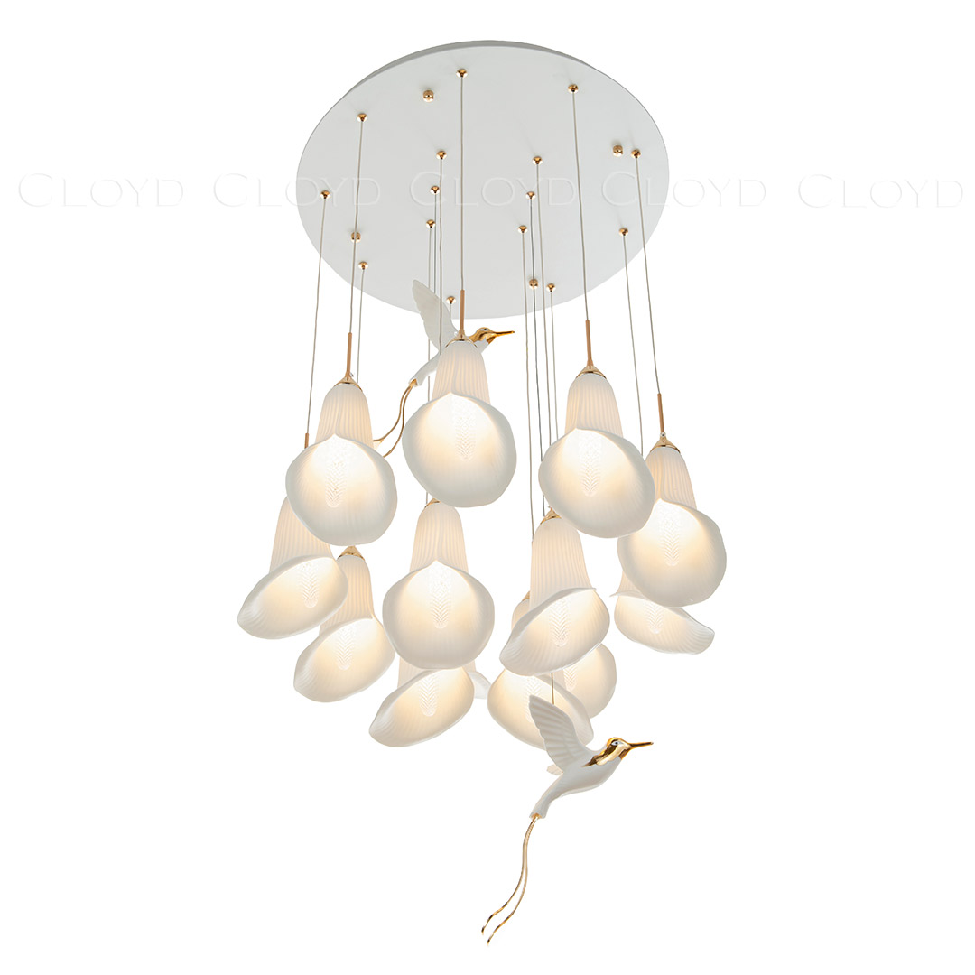 Люстра подвесная Cloyd OSANNA (Клойд Осанна) C13 / арт.11889, ø: 60 см. высота: 110 см, источник света: E14 х 13 шт, цвет металла - белый (окраска). Фурнитура - золото. Особенности: керамика высокого качества, птица выполнена из фарфора.Гарантия: 1 год.