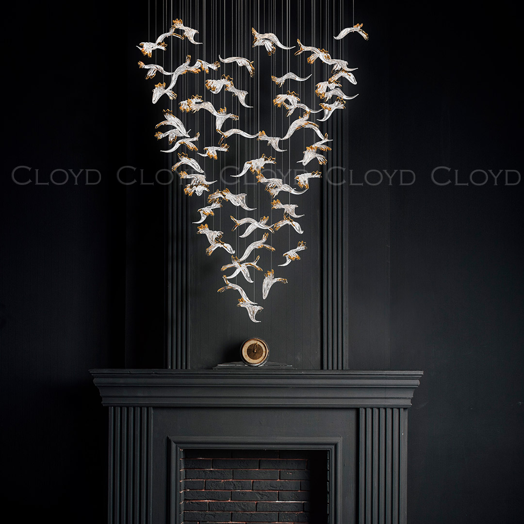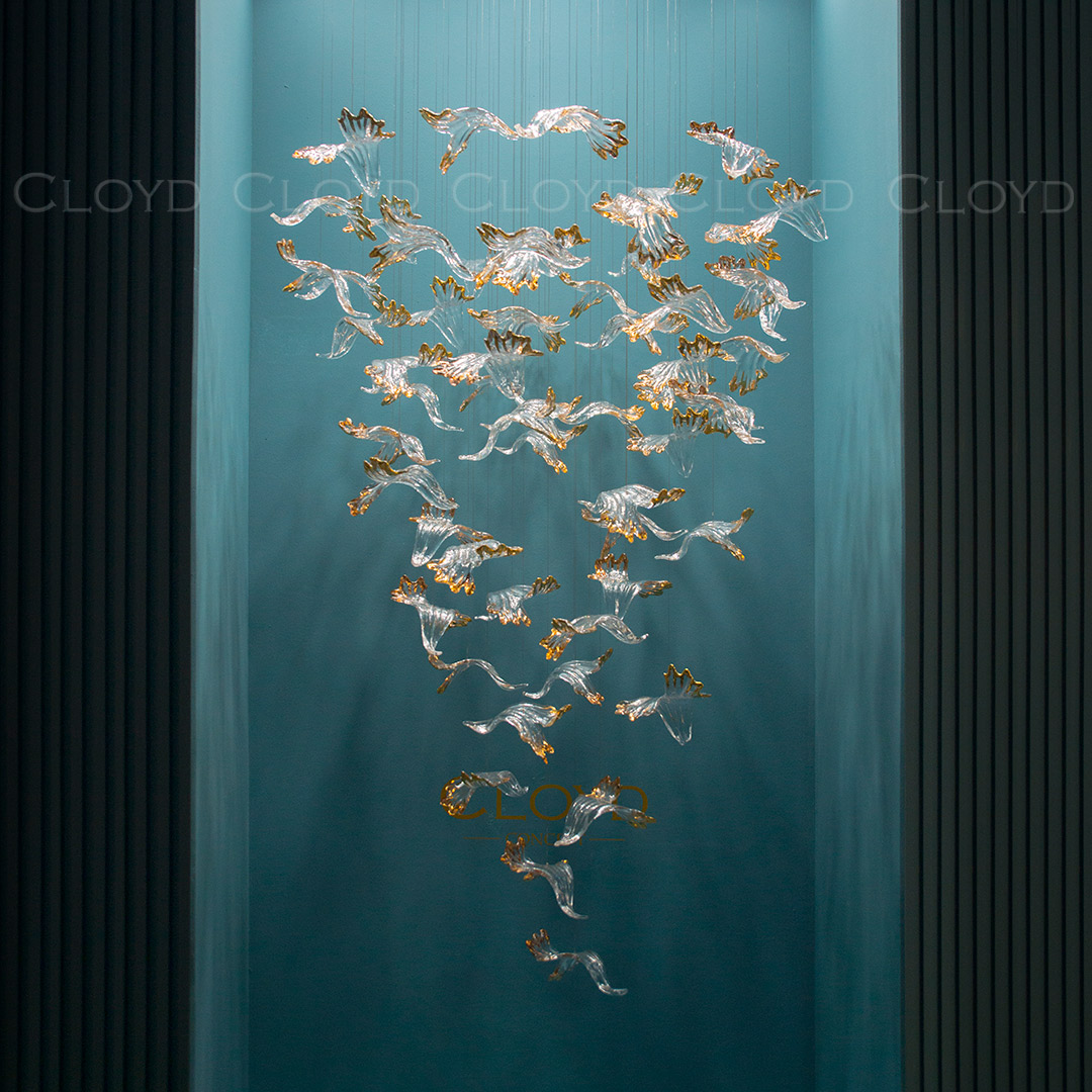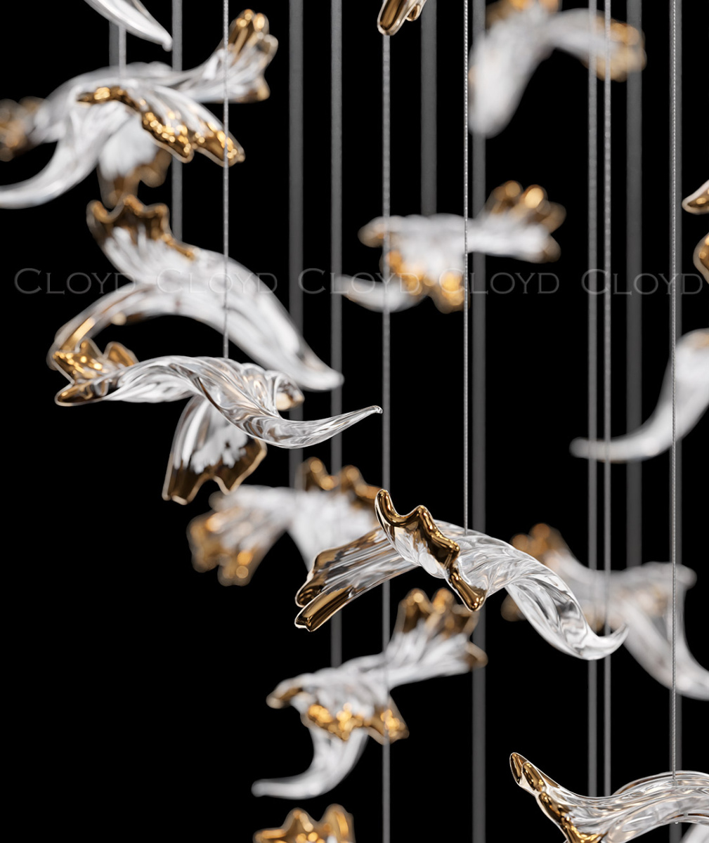 Световая композиция Cloyd AERIA 1703 (Клойд Аэрия) S60 / арт.60001, ø: 80 см. высота: 200 см. Без потолочной чаши. Композиция включает в себя: 60 стеклянных элементов (цвет стекла - прозрачный и золото), потолочные крепежи, трос, фиксаторы для стекол и сопроводительную документацию для монтажа.Рекомендуемое количество источников света — 9 шт (не включены в стоимость). Возможны любые изменения размеров и форм под ваш проект.