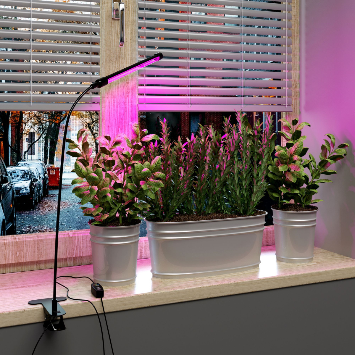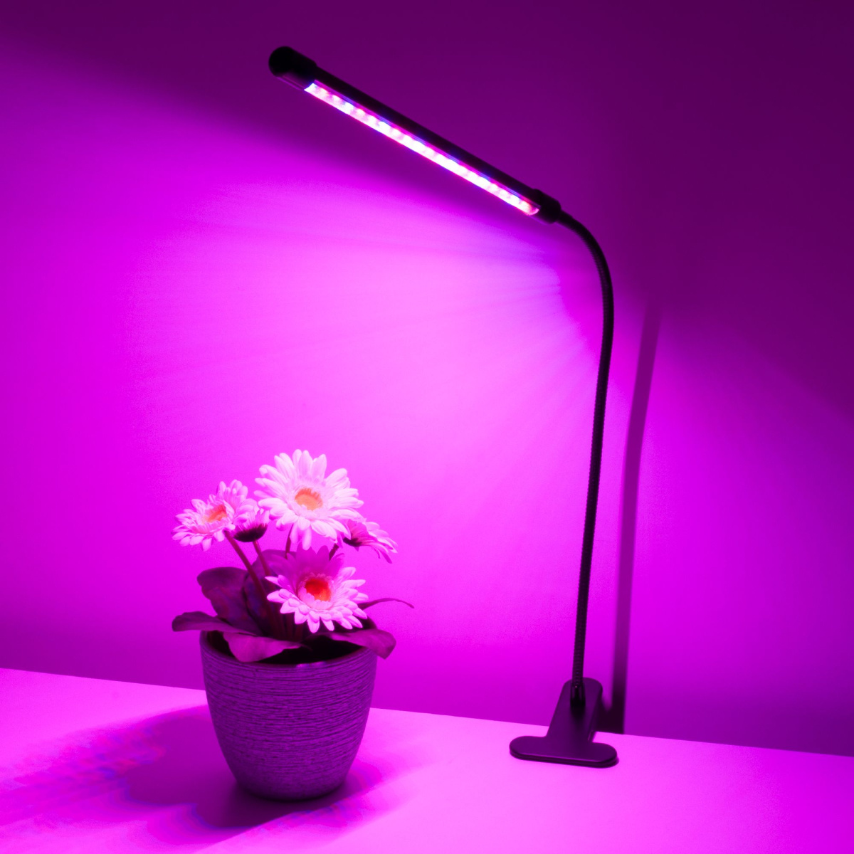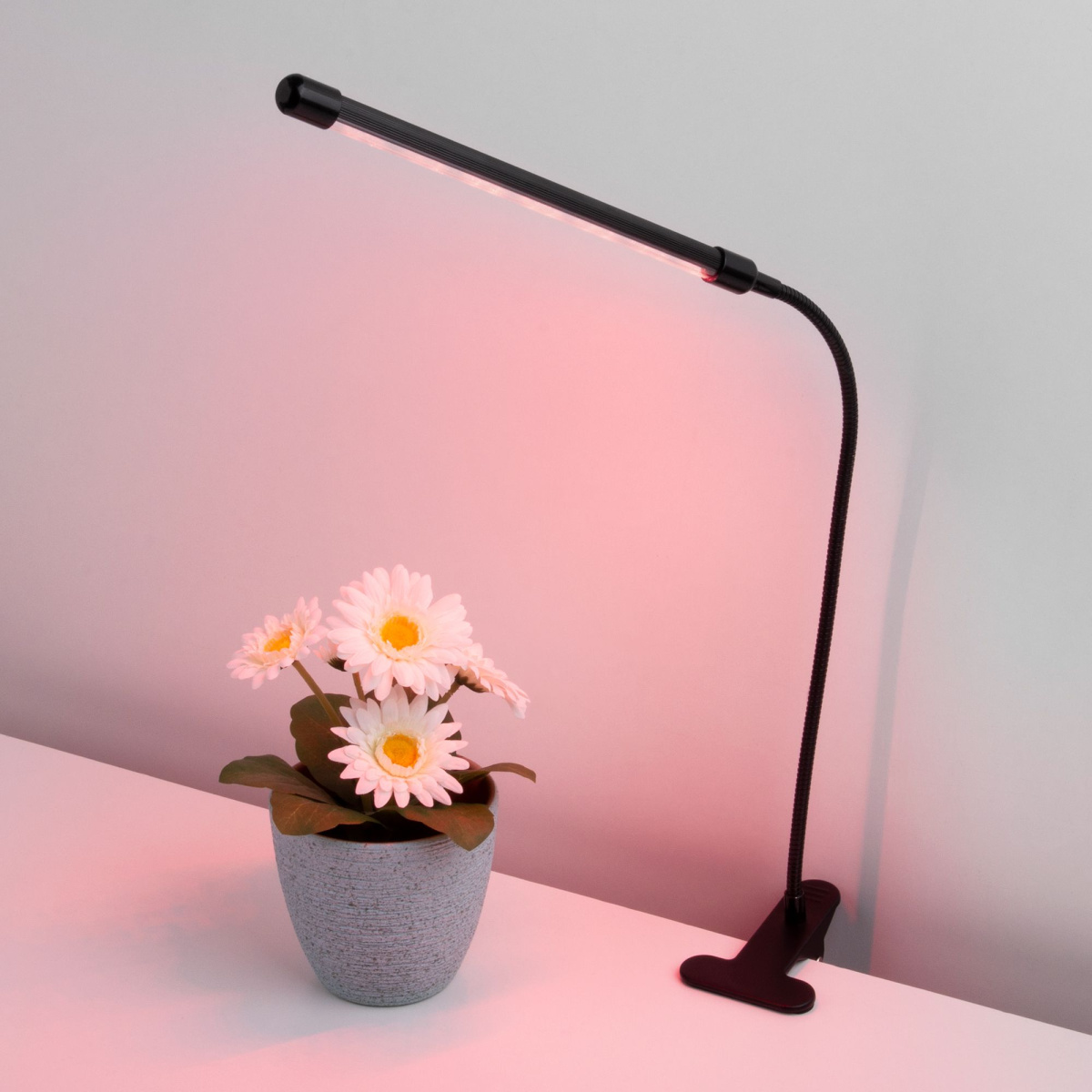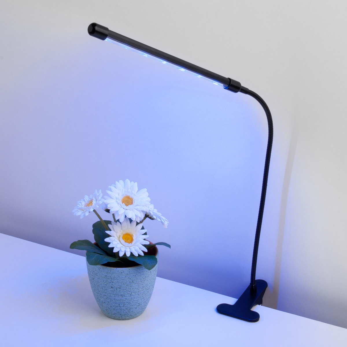 Фитолампа на прищепке имеет гибкое основание и пульт управления. С помощью прищепки светильник легко можно зафиксировать на выступах столов, полок и подоконников. При помощи гибкой ножки можно изменять направление светового потока на 360 градусов. Пульт управления, расположенный на сетевом шнуре позволяет выбрать один из трёх режимов работы, поставить таймер или отрегулировать яркость.