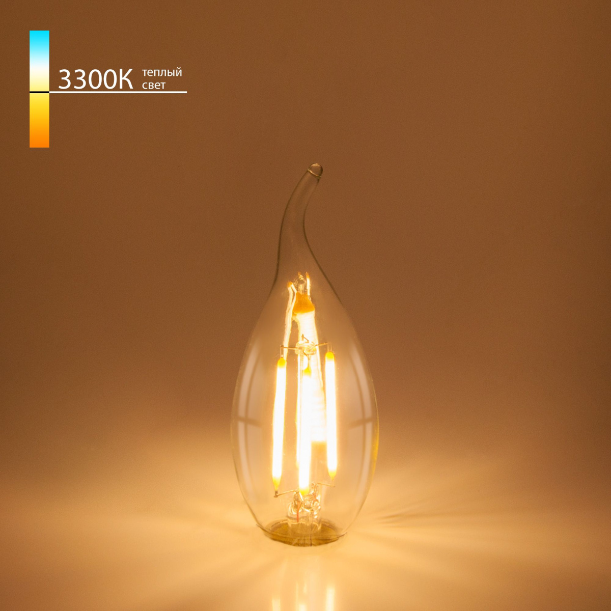 Филаментная светодиодная лампа "Свеча на ветру" C35 9W 3300K E14. Это вид светодиодных ламп, которые внешне максимально приближены к лампам накаливания. Они имеют полностью прозрачную стеклянную колбу и цоколь, а внутри расположены светодиоды вместо нити накала.