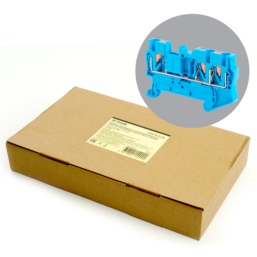 LD573-2-25 ЗНИ Зажим самозажимной, 3-проводной проходной 2,5 мм² (JXB PT 2,5), синий