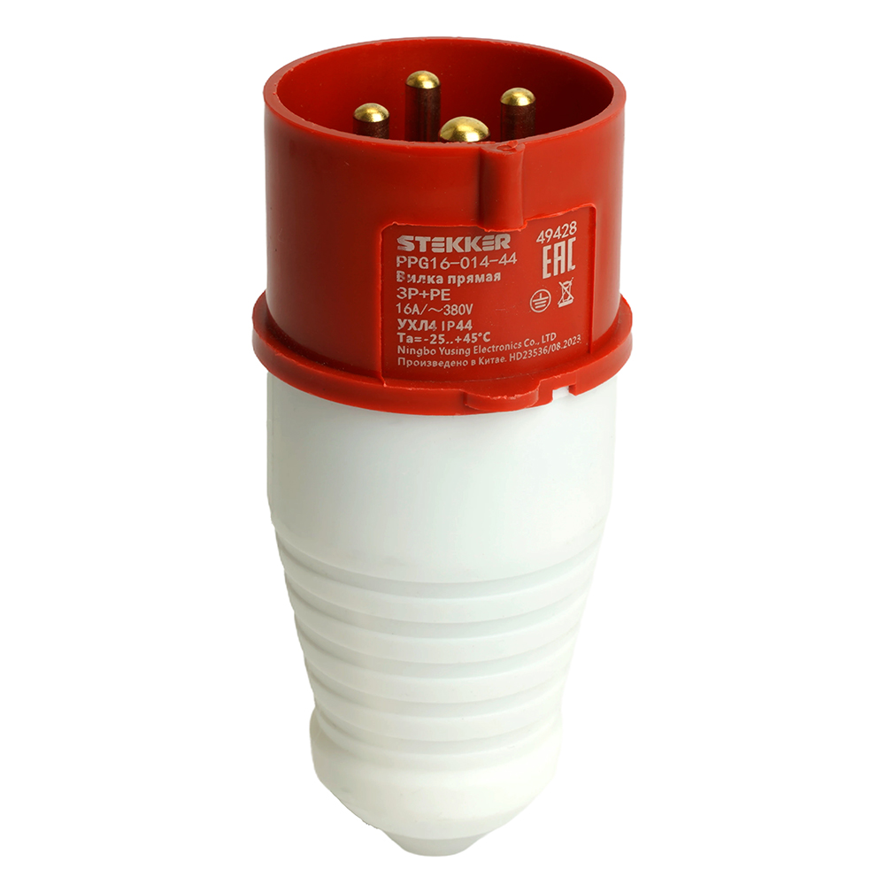 Вилка прямая STEKKER PPG16-014-44, -, тип установки переносная. Для проводов сечением 2,5мм2. Материал изделия PP; цвет красный; размер 122*55*65мм. Номинальное напряжение 380В, Номинальный ток 16А, диапазон рабочих температур -25°C - +45°C, степень пылевлагозащиты 44