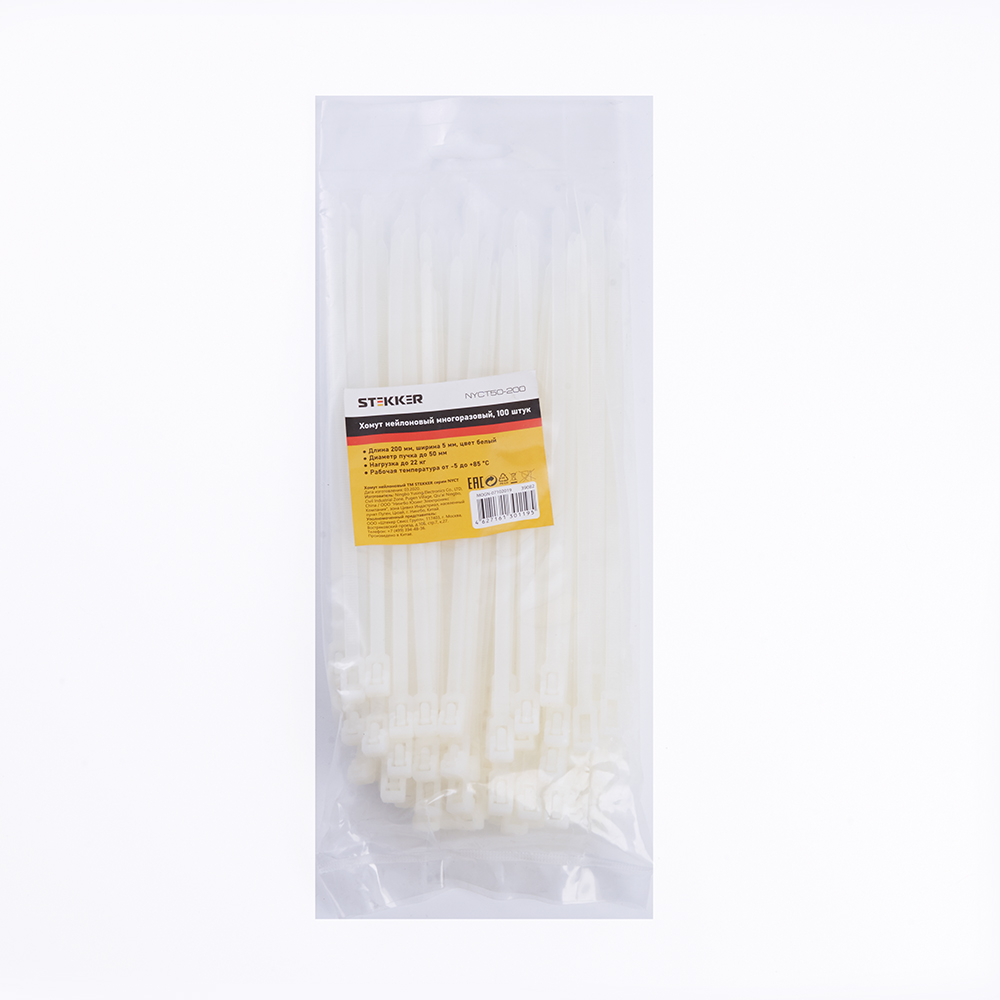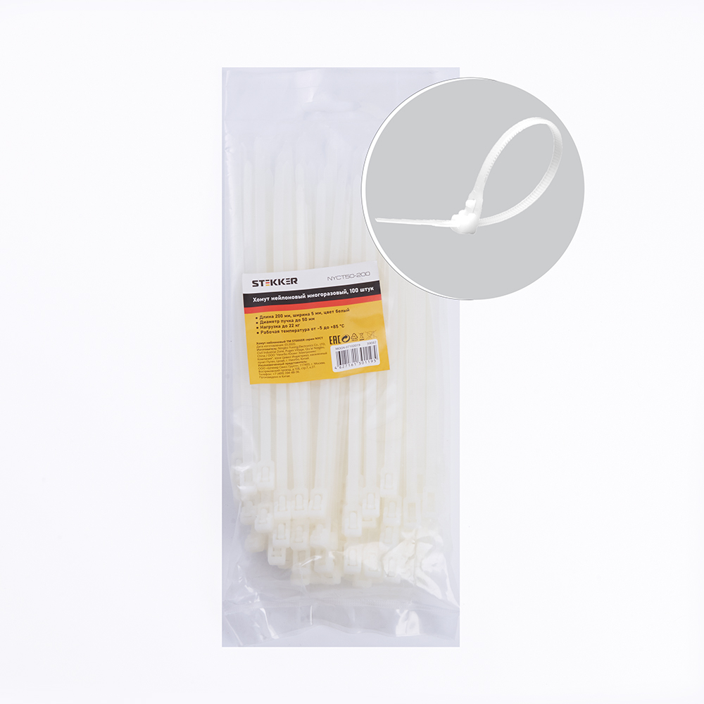 Хомут нейлоновый многоразовый STEKKER NYCT50-200 5x200 мм, белый, упаковка 100 шт