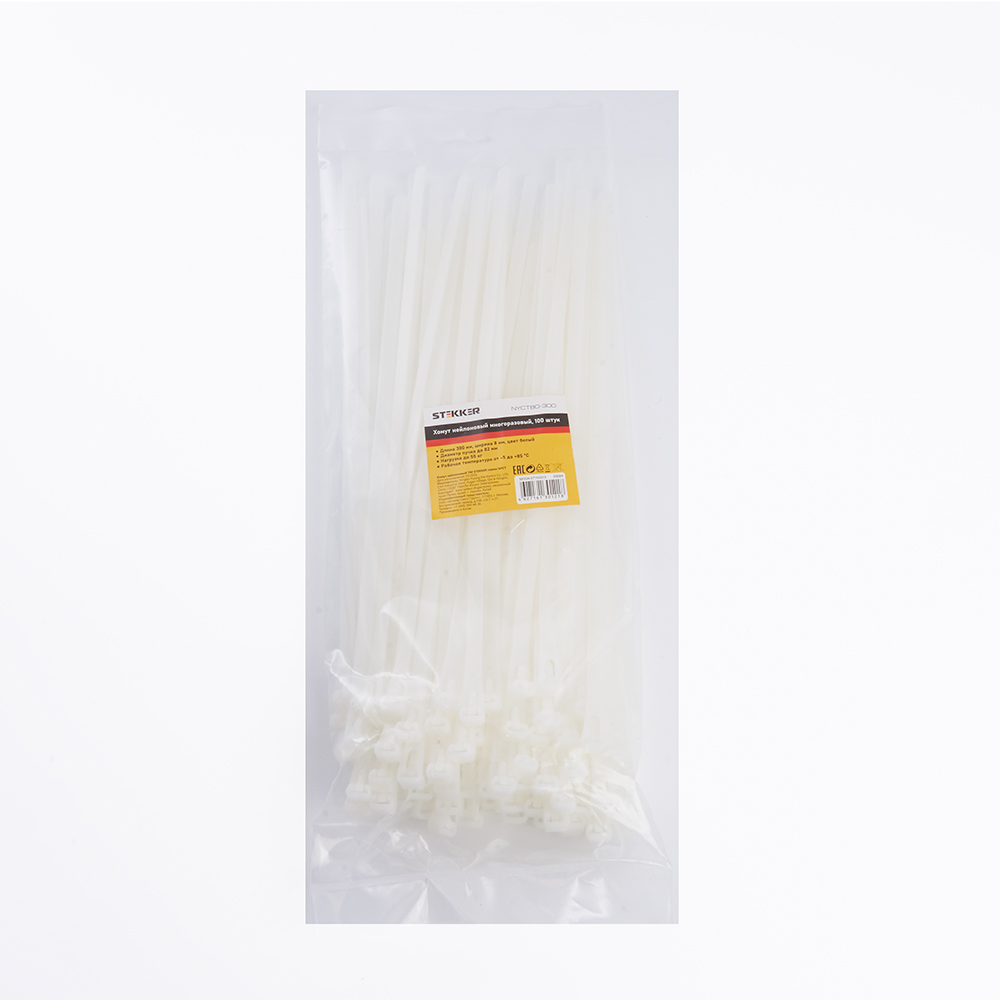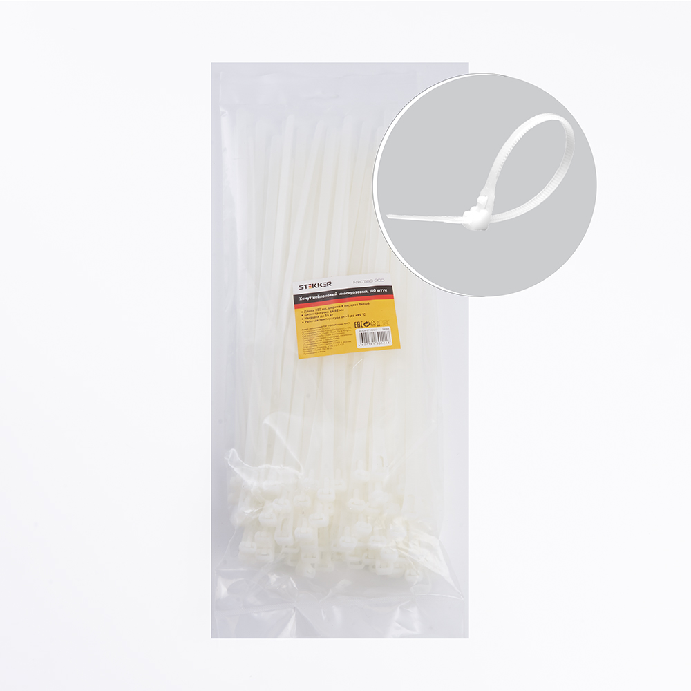 Хомут нейлоновый многоразовый STEKKER NYCT80-300 8x300 мм, белый, упаковка 100 шт