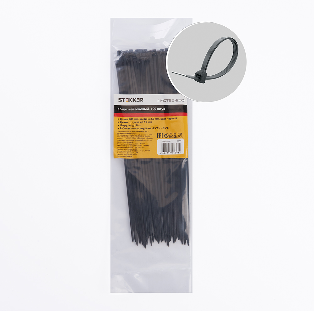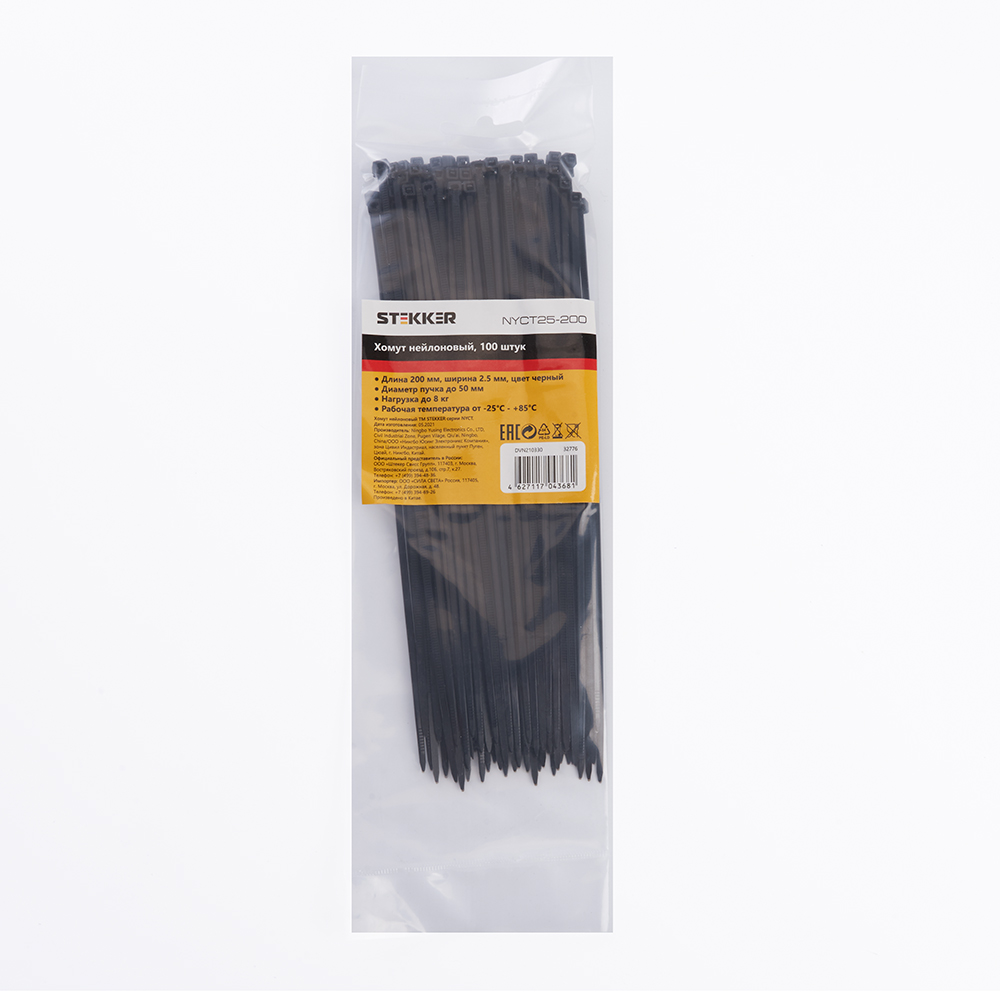 Хомут электромонтажный STEKKER NYCT25-200, одноразовый, черный, материал - нейлон , максимальный диаметр пучка - 50мм, нагрузка - 8кг, диапазон рабочих температур -25°C - +85°C, рекомендуемая температура хранениня +5°C - +25°C
