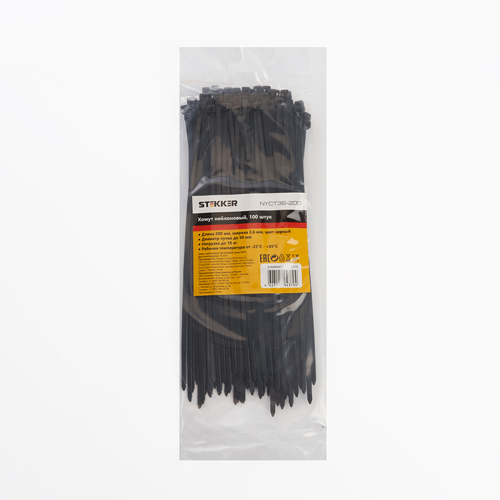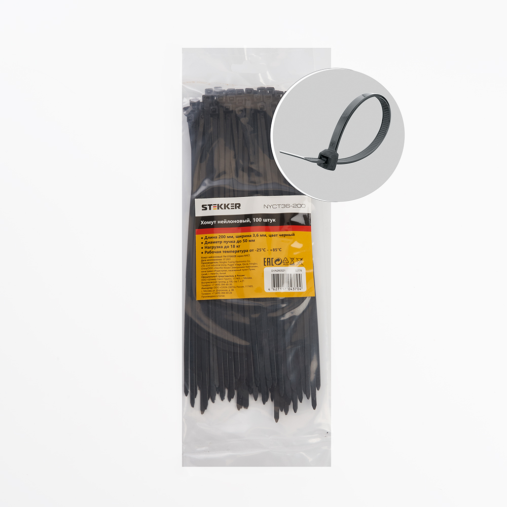 Хомут электромонтажный STEKKER NYCT36-200, одноразовый, черный, материал - нейлон , максимальный диаметр пучка - 50мм, нагрузка - 18кг, диапазон рабочих температур -25°C - +85°C, рекомендуемая температура хранениня +5°C - +25°C