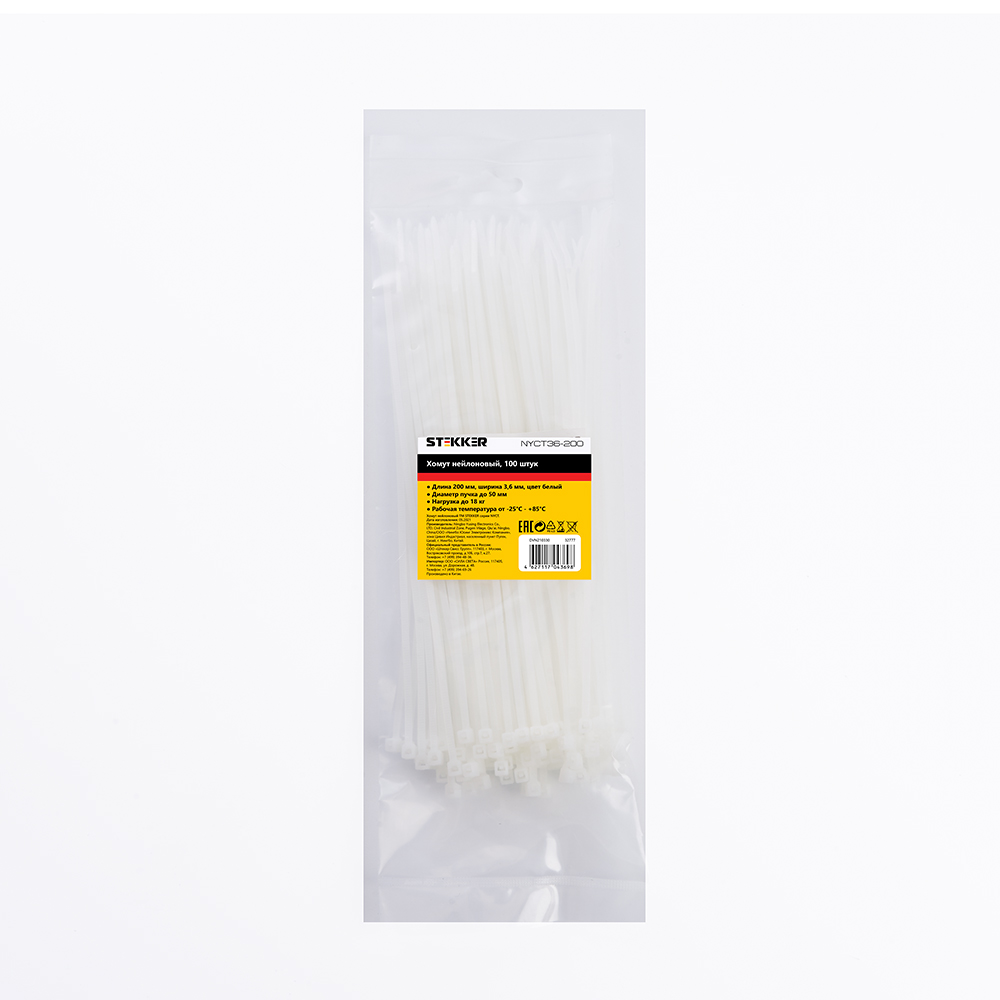 Хомут электромонтажный STEKKER NYCT36-200, одноразовый, белый, материал - нейлон , максимальный диаметр пучка - 50мм, нагрузка - 18кг, диапазон рабочих температур -25°C - +85°C, рекомендуемая температура хранениня +5°C - +25°C