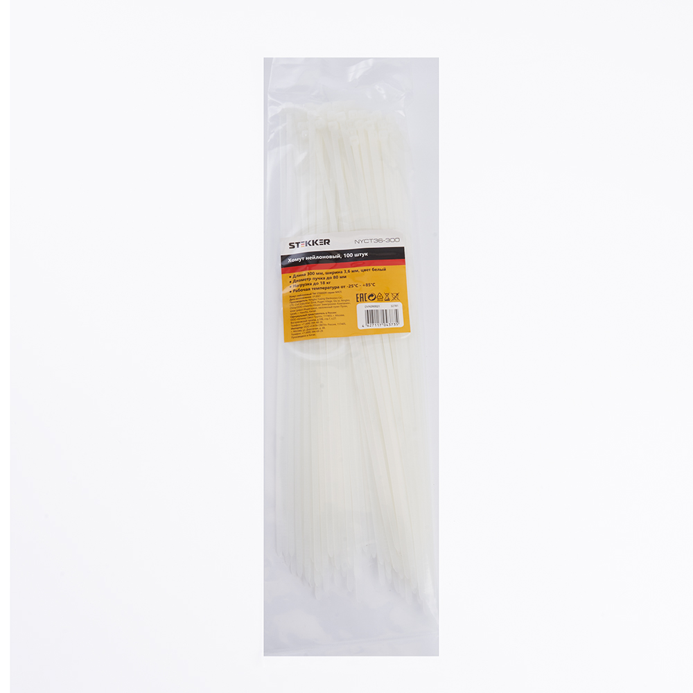 Хомут электромонтажный STEKKER NYCT36-300, одноразовый, белый, материал - нейлон , максимальный диаметр пучка - 80мм, нагрузка - 18кг, диапазон рабочих температур -25°C - +85°C, рекомендуемая температура хранениня +5°C - +25°C
