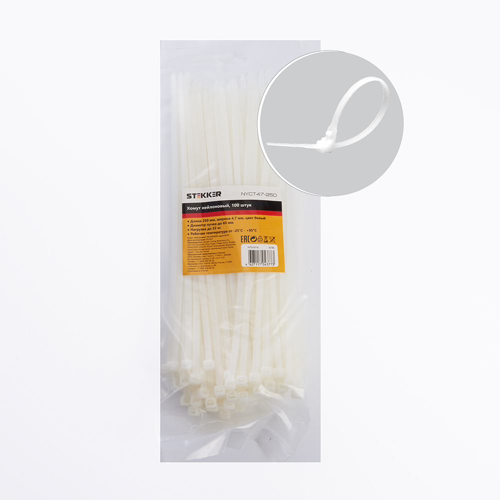 Хомут электромонтажный STEKKER NYCT47-250, одноразовый, белый, материал - нейлон , максимальный диаметр пучка - 65мм, нагрузка - 22кг, диапазон рабочих температур -25°C - +85°C, рекомендуемая температура хранениня +5°C - +25°C