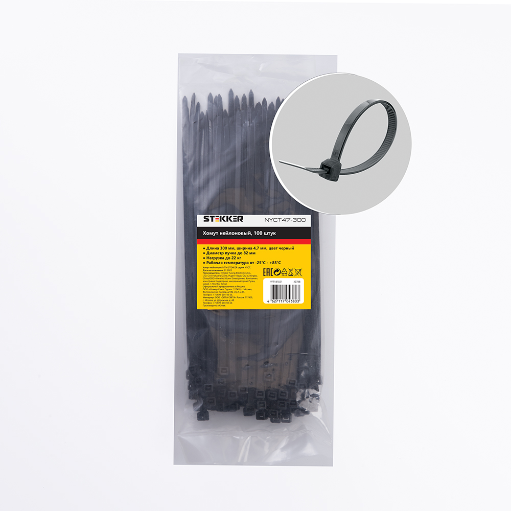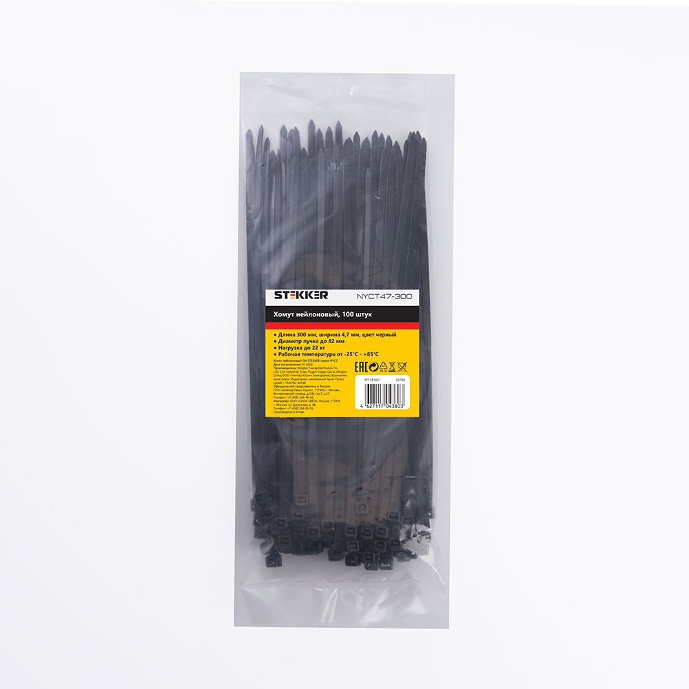 Хомут электромонтажный STEKKER NYCT47-300, одноразовый, черный, материал - нейлон , максимальный диаметр пучка - 82мм, нагрузка - 22кг, диапазон рабочих температур -25°C - +85°C, рекомендуемая температура хранениня +5°C - +25°C