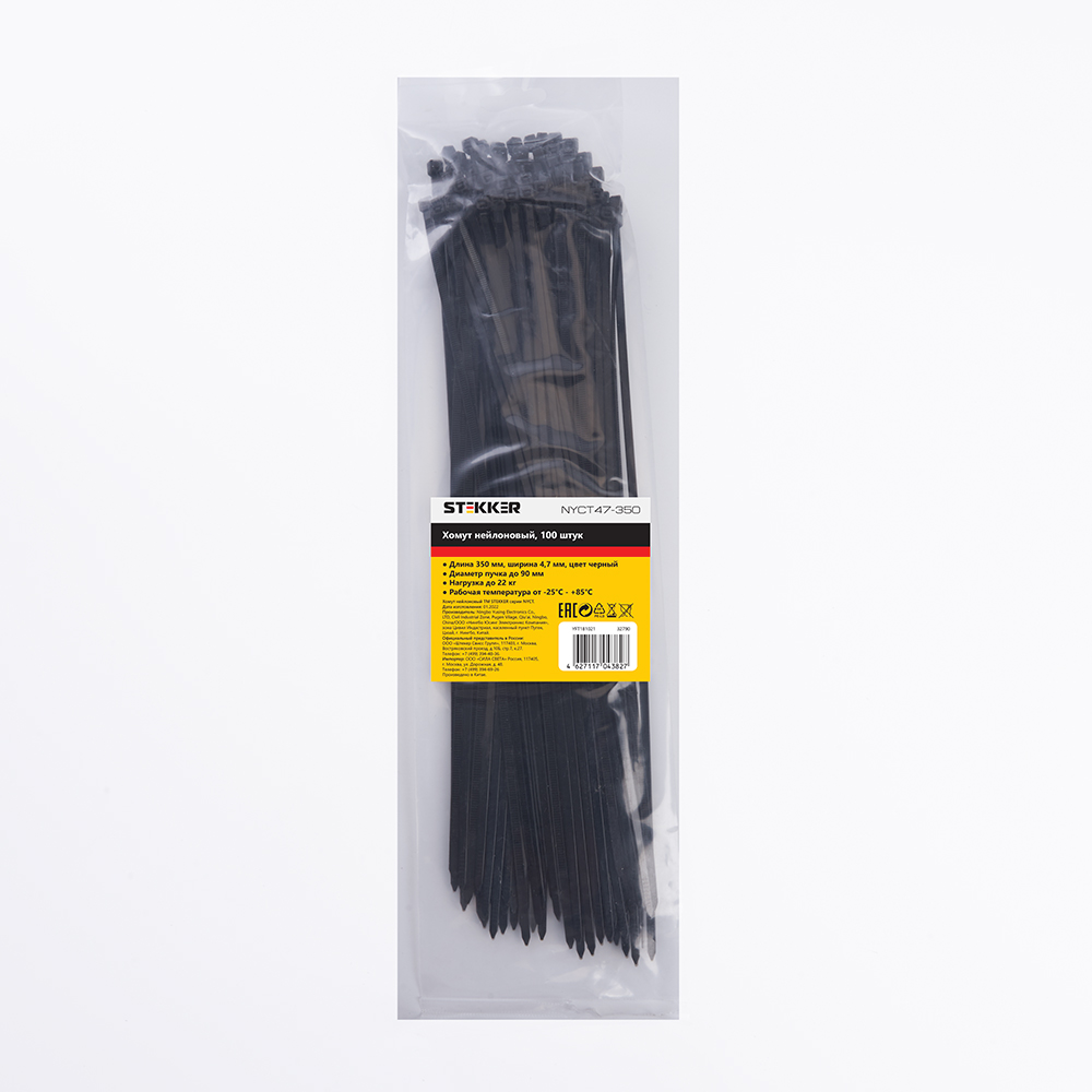 Хомут электромонтажный STEKKER NYCT47-350 , одноразовый, черный, материал - нейлон , максимальный диаметр пучка - 90мм, нагрузка - 22кг, диапазон рабочих температур -25°C - +85°C, рекомендуемая температура хранениня +5°C - +25°C