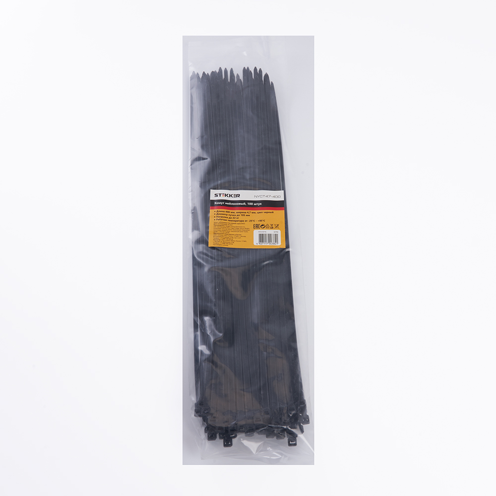 Хомут электромонтажный STEKKER NYCT47-400, одноразовый, черный, материал - нейлон , максимальный диаметр пучка - 105мм, нагрузка - 22кг, диапазон рабочих температур -25°C - +85°C, рекомендуемая температура хранениня +5°C - +25°C
