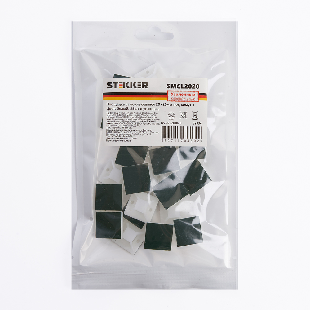 Площадка под хомут STEKKER SMCL2020 самоклеющаяся, цвет белый, размер 20*20мм., материал: нейлон . Максимальный размер хомута: 4,7мм., 25 шт в упаковке.