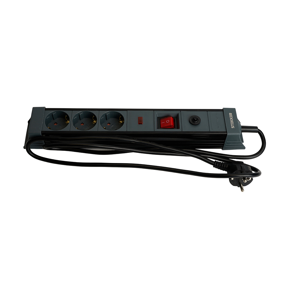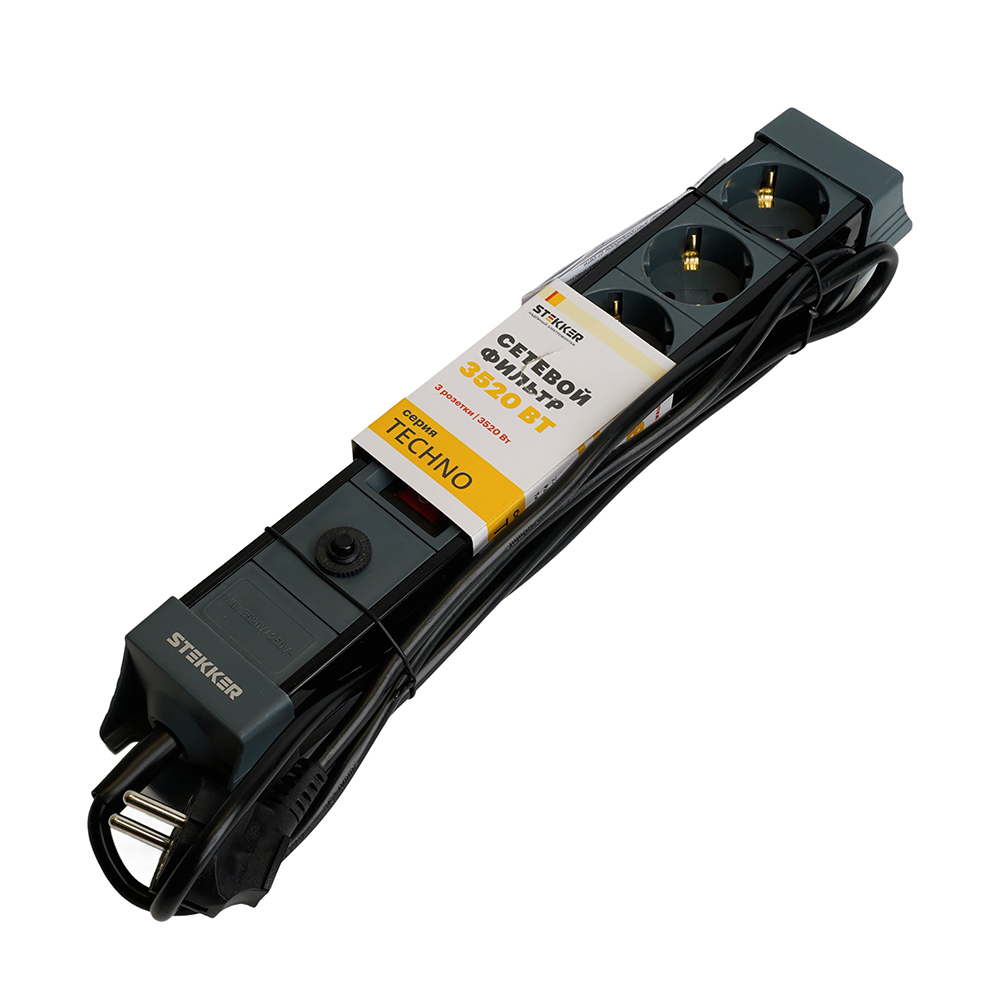 Сетевой фильтр 3-местный с/з STEKKER 3x1мм2, 5 м, 250В, 16А, серия Techno, HM22-31-05, черный