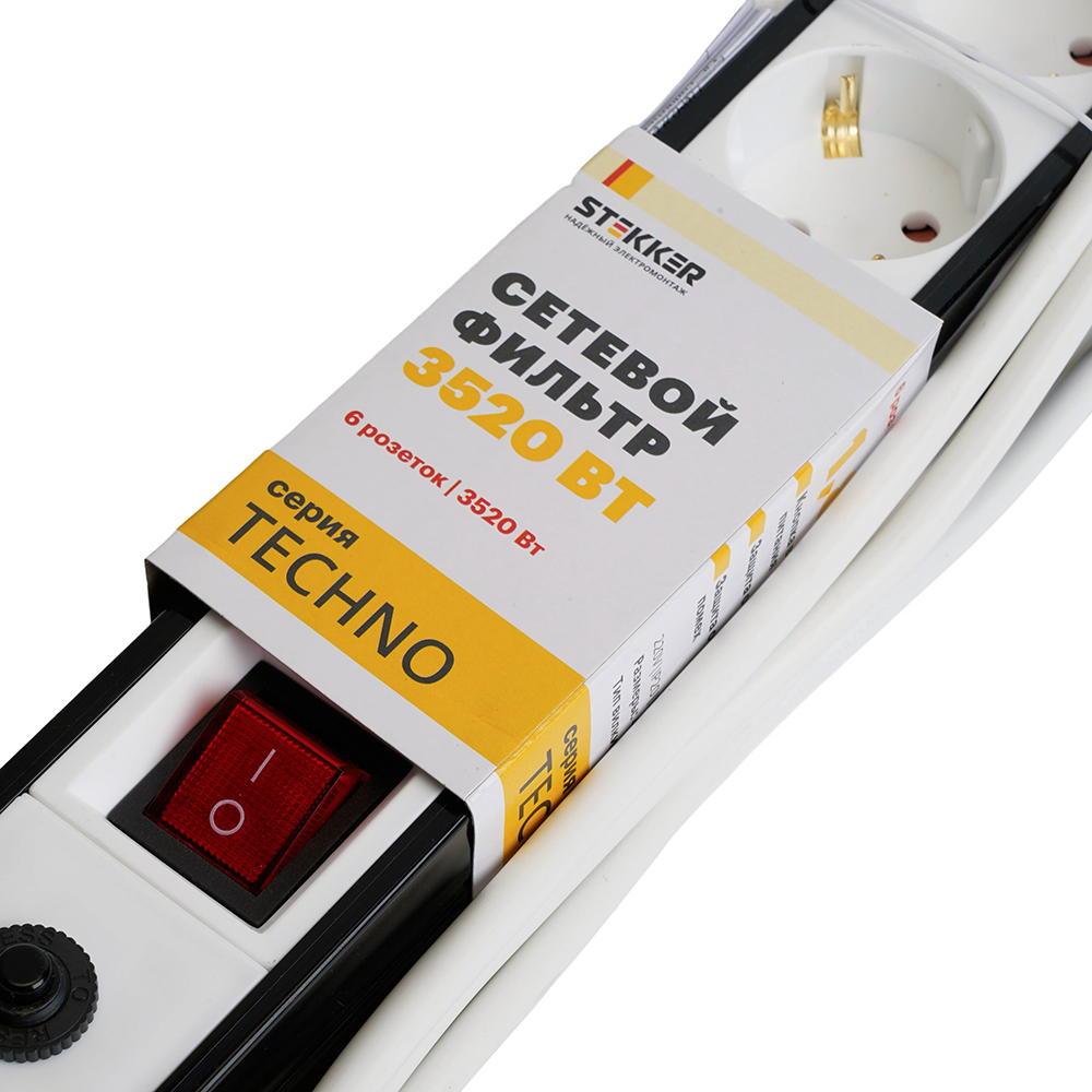 Сетевой фильтр 6-местный с/з STEKKER 3x1мм2, 1,8 м, 250В, 16А, серия Techno, HM22-61-02, белый