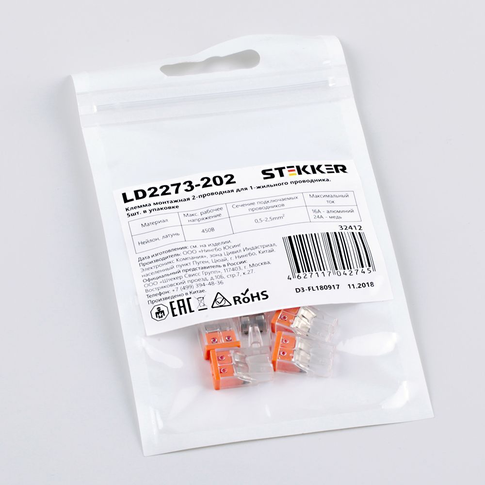 Клемма монтажная компактная STEKKER LD2273-202 , 2-проводная 0,5-2,5 мм2, 450В, 24A, без пасты, материал изделия поликарбонат, латунь, сталь. Тип провода одножильный, материал провода медь, температура окружающей среды -20...+40°C