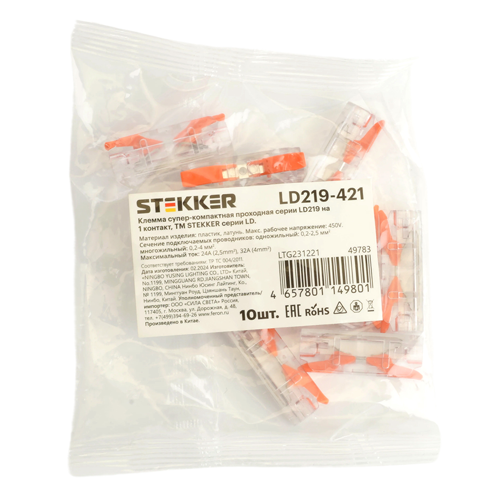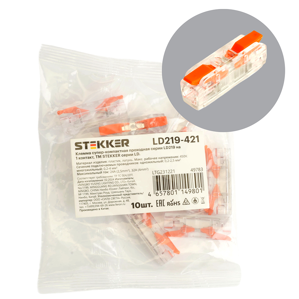 Клемма супер-компактная проходная серии 219 на 1 контакт STEKKER,LD219-421, 1ввод,1вывод на полюс (DIY упак 10 шт)