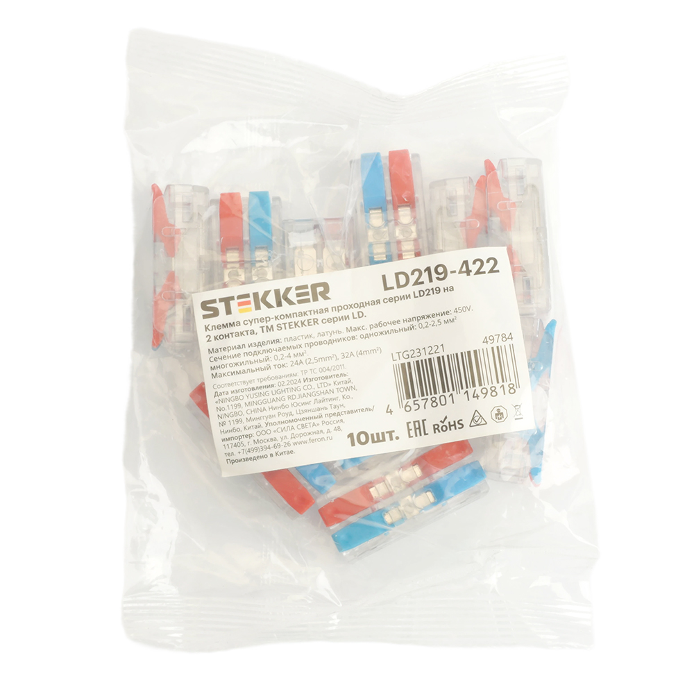 Клемма супер-компактная проходная серии 219 на 2 контакта STEKKER,LD219-422, (DIY упак 10 шт)