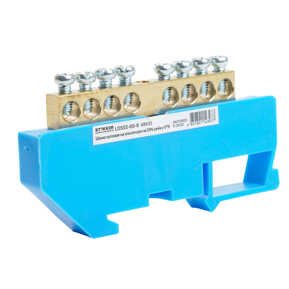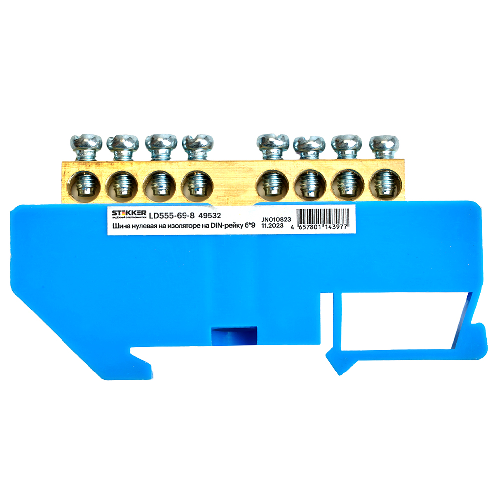 Шина"N" на изоляторе STEKKER 6*9 на DIN-рейку 8 выводов, синий, LD555-69-8