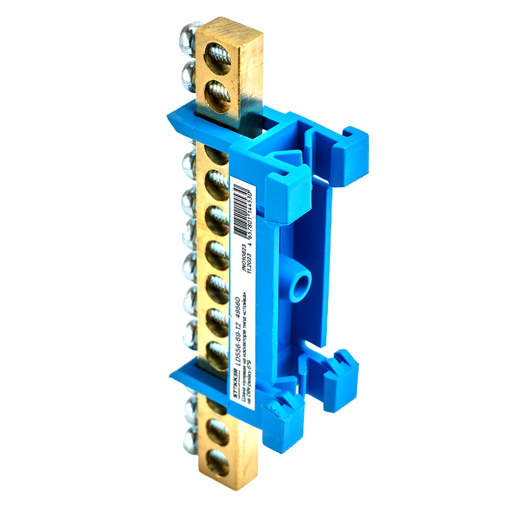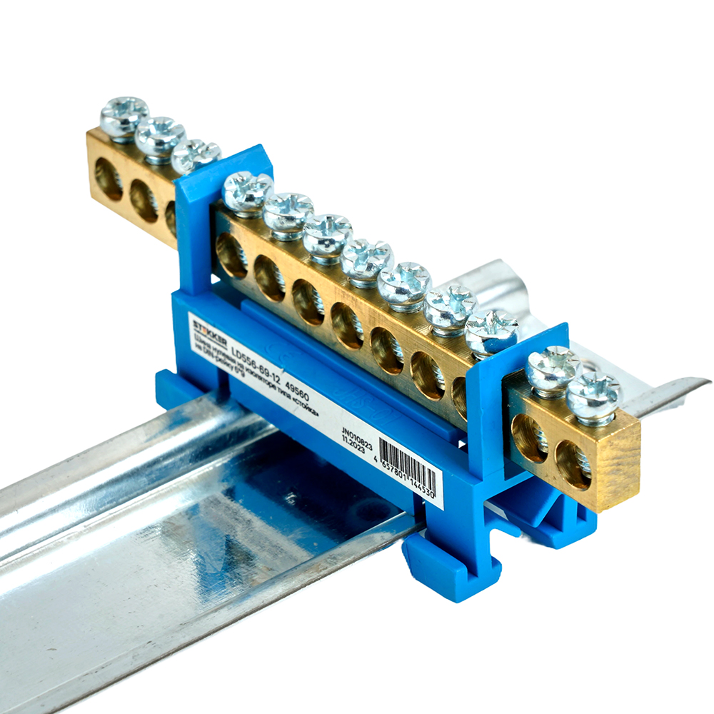Шина "N" на изоляторе STEKKER 6*9 тип "стойка" на DIN-рейку 12 выводов, синий, LD556-69-12