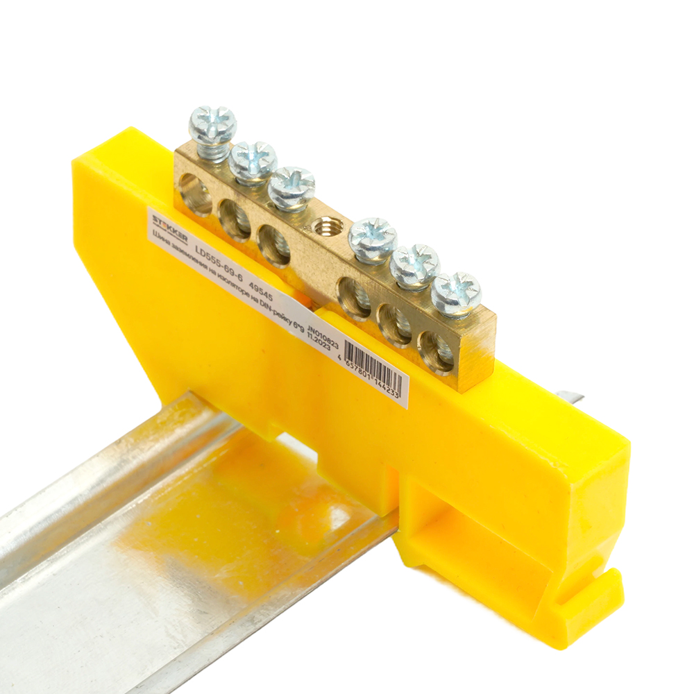 LD555-69-6 Шина "PE" на изоляторе 6*9 на DIN-рейку 6 выводов, желтый