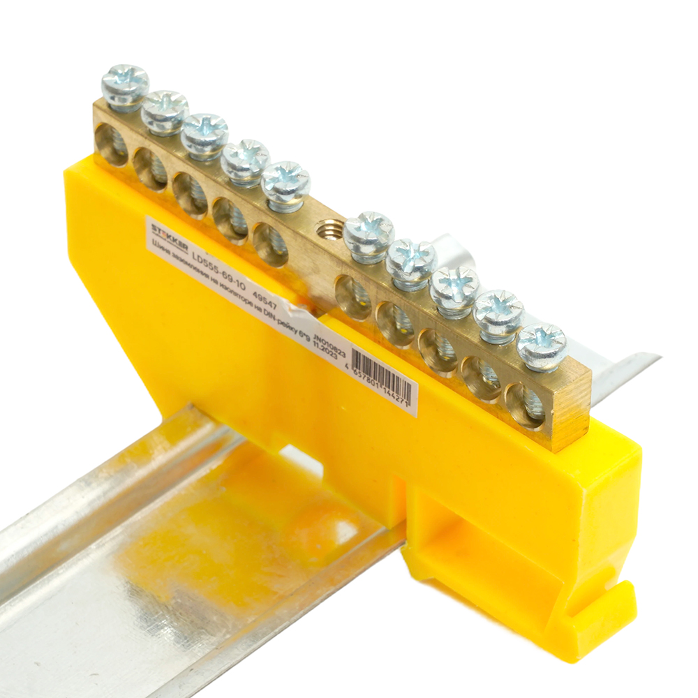 LD555-69-10 Шина "PE" на изоляторе 6*9 на DIN-рейку 10 выводов, желтый