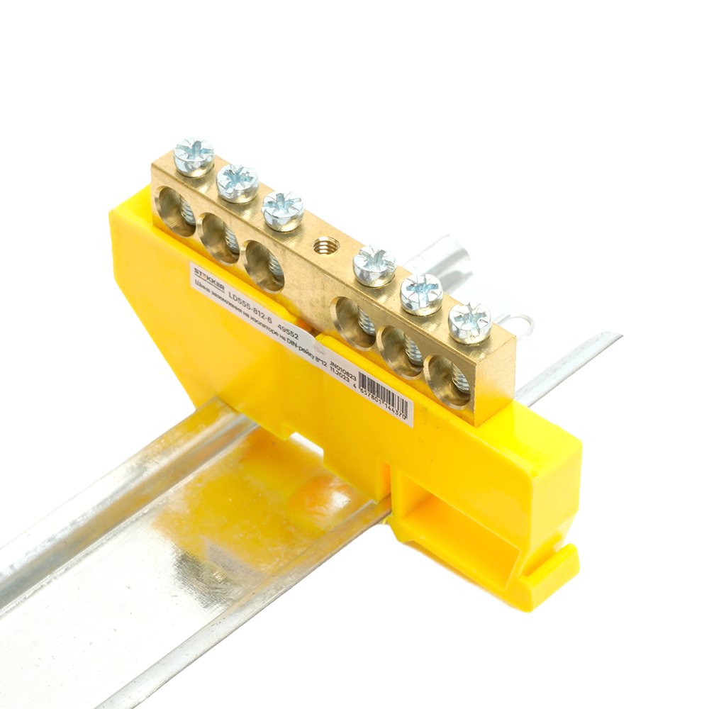 Шина "PE" STEKKER на изоляторе 8*12 на DIN-рейку 6 выводов, желтый, LD555-812-6