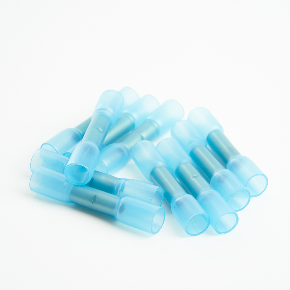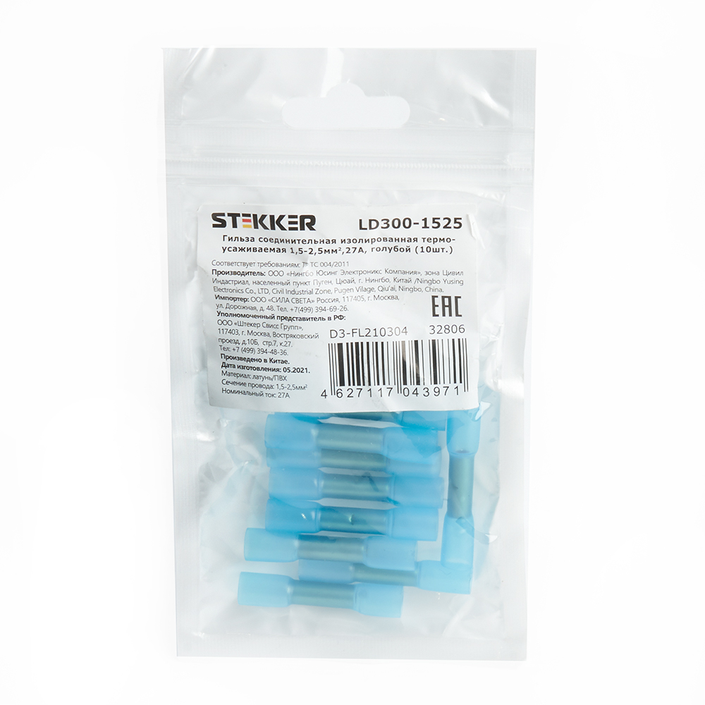 Термоусадочные коннекторы STEKKER LD300-1525, длина 38мм. 10шт. в наборе, цвет: голубой. Коэффициент усадки 2:1, диапазон рабочих температур -10..+35°C, температура усадки +85..+125°C, номинальный ток 27А, для проводов сечением мм2.