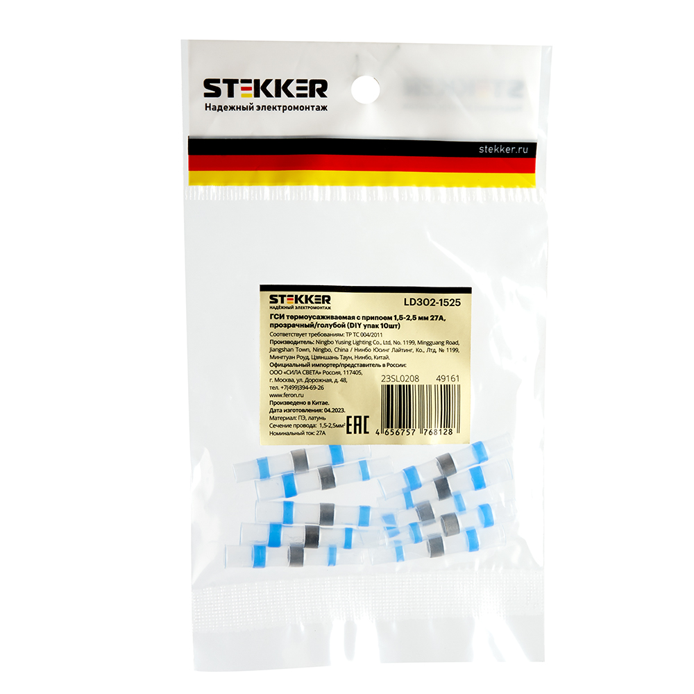 Термоусадочные коннекторы STEKKER LD302-15-25, длина 40мм. 10шт. в наборе, цвет: прозрачный, голубой. Коэффициент усадки 2:1, диапазон рабочих температур -10..+35°C, температура усадки +85..+125°C, номинальный ток 27А, для проводов сечением мм2.