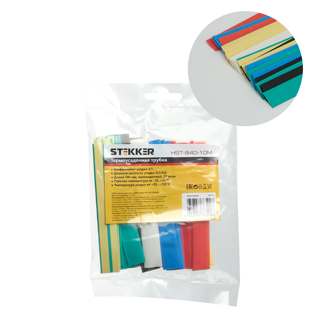 Термоусадочные трубки STEKKER HST-840-10M, длина 100мм. 21шт. в наборе, цвет: многоцветный . Коэффициент усадки 2:1, диапазон рабочих температур -55..+125°C, температура усадки +85..+125°C, номинальный ток 32А, для проводов сечением мм2.