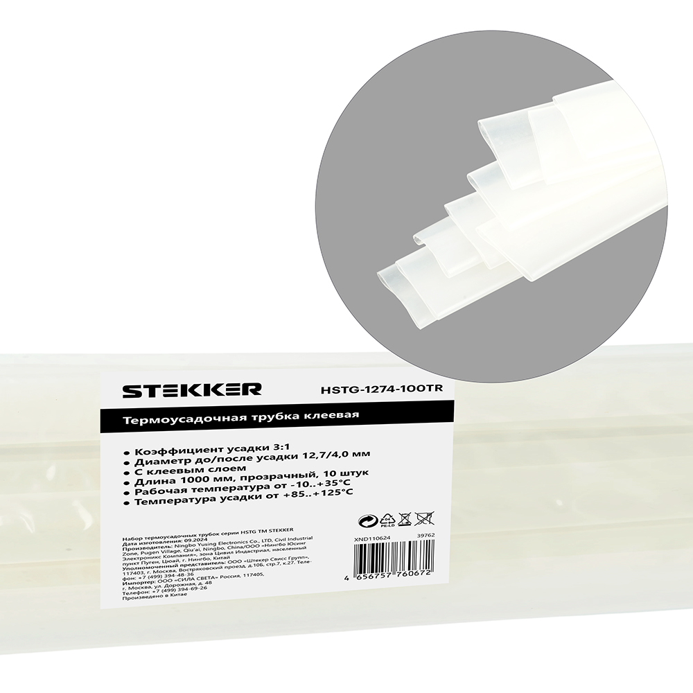 Термоусадочные трубки STEKKER HSTG-1274-100TR, длина 1000мм. 10шт. в наборе, цвет: прозрачный. Коэффициент усадки 3:1, диапазон рабочих температур -10..+35°C, температура усадки +85..+125°C, номинальный ток 32А, для проводов сечением мм2.