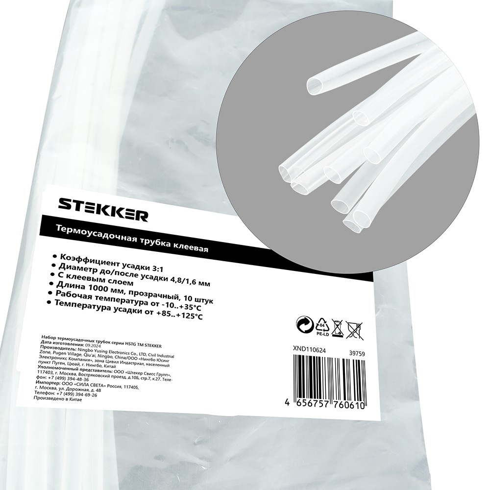 Термоусадочные трубки STEKKER HSTG-482-100TR, длина 1000мм. 10шт. в наборе, цвет: прозрачный. Коэффициент усадки 3:1, диапазон рабочих температур -10..+35°C, температура усадки +85..+125°C, номинальный ток 32А, для проводов сечением мм2.