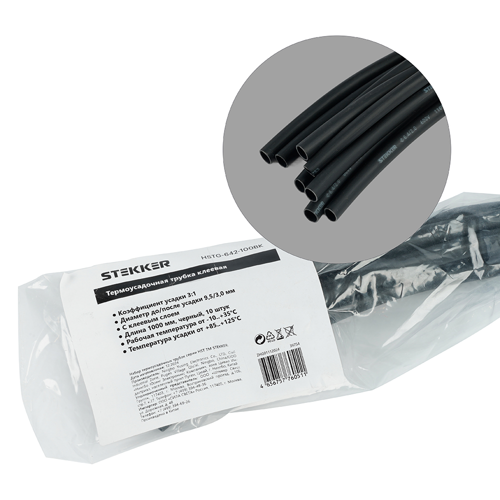 Термоусадочные трубки STEKKER HSTG-953-100BK, длина 1000мм. 10шт. в наборе, цвет: черный. Коэффициент усадки 3:1, диапазон рабочих температур -10..+35°C, температура усадки +85..+125°C, номинальный ток 32А, для проводов сечением мм2.