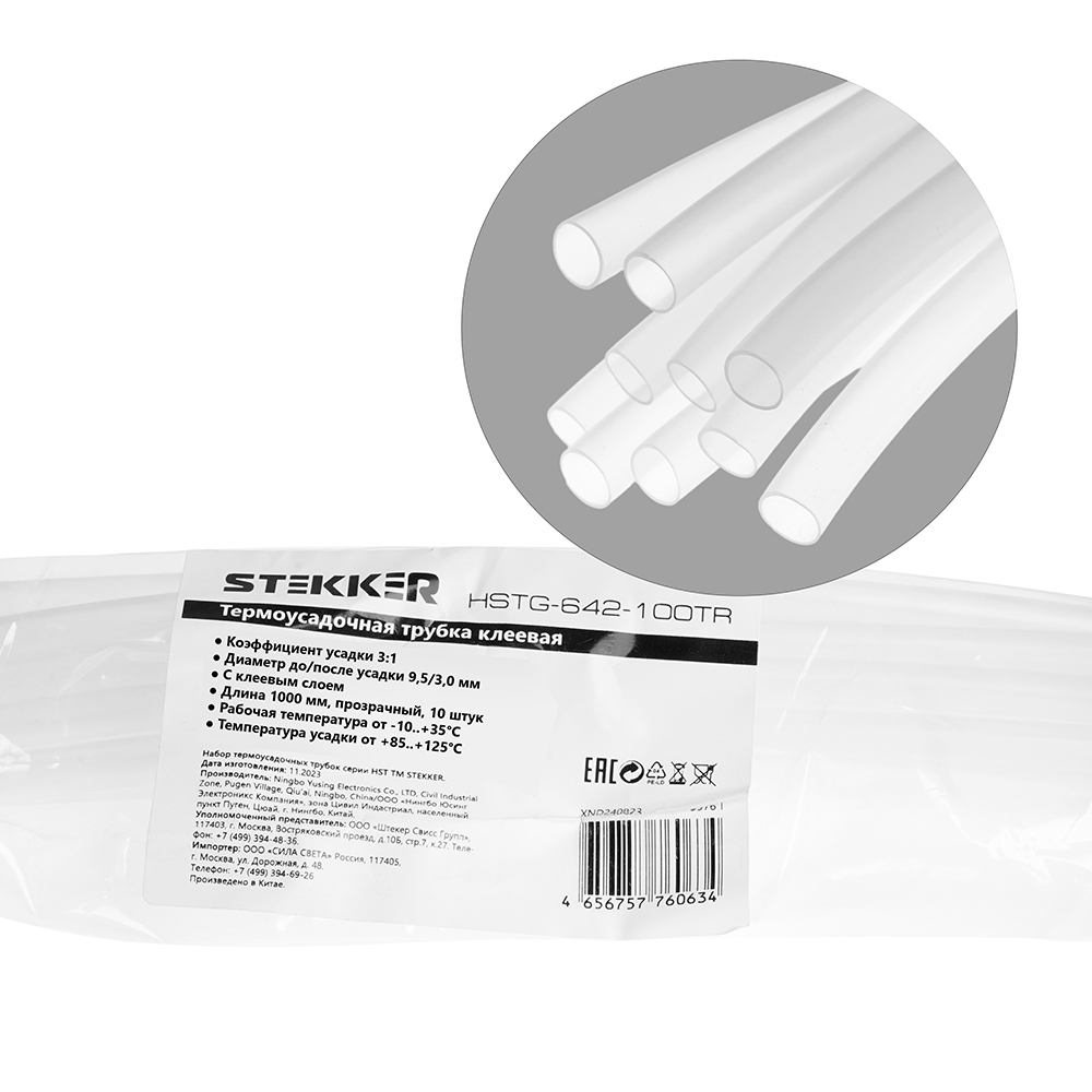Термоусадочные трубки STEKKER HSTG-953-100TR, длина 1000мм. 10шт. в наборе, цвет: прозрачный. Коэффициент усадки 3:1, диапазон рабочих температур -10..+35°C, температура усадки +85..+125°C, номинальный ток 32А, для проводов сечением мм2.