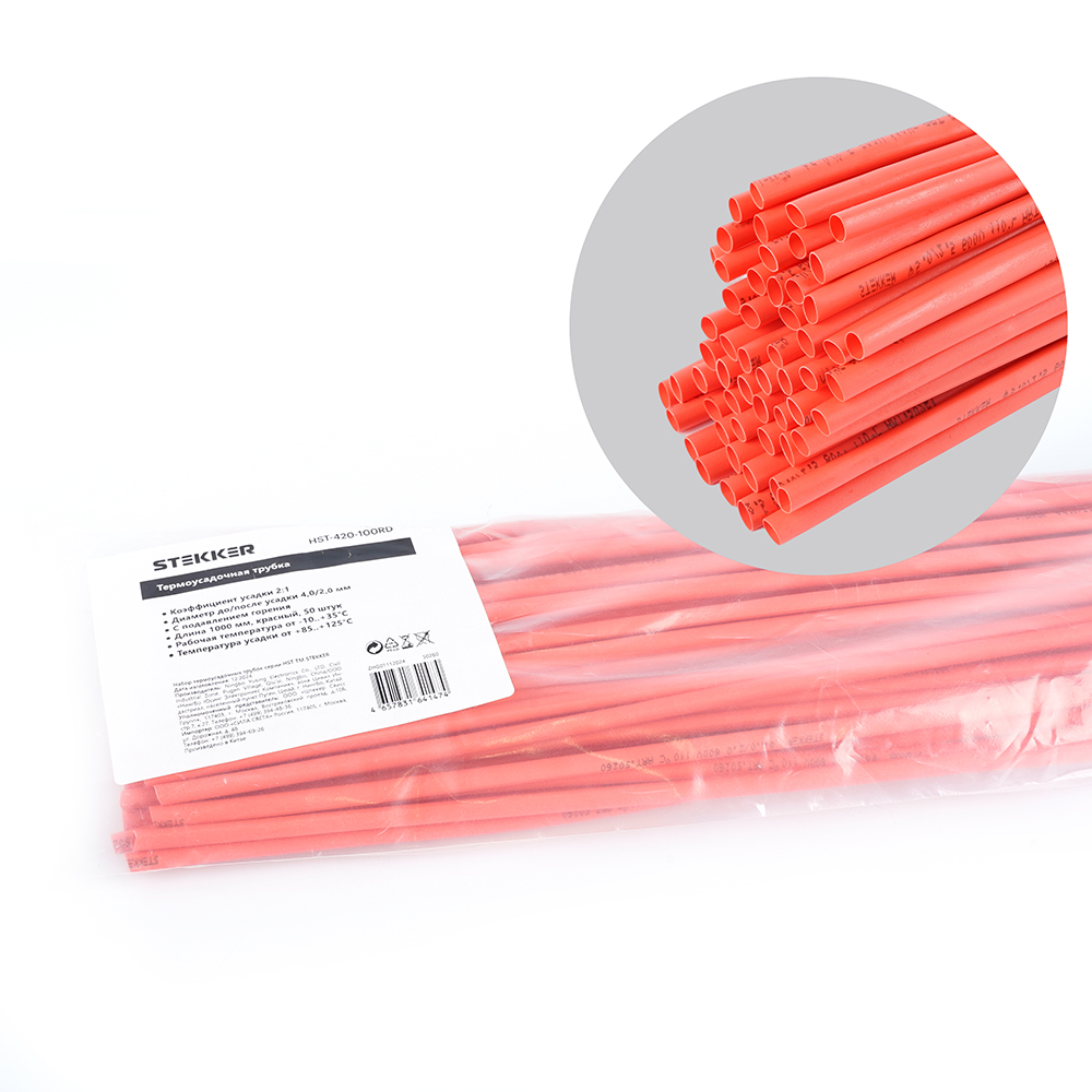 Термоусадочные трубки STEKKER HST-420-100RD, длина 1000мм. 50шт. в наборе, цвет: красный. Коэффициент усадки 2:1, диапазон рабочих температур -10..+35°C, температура усадки +85..+125°C, номинальный ток 32А, для проводов сечением мм2.
