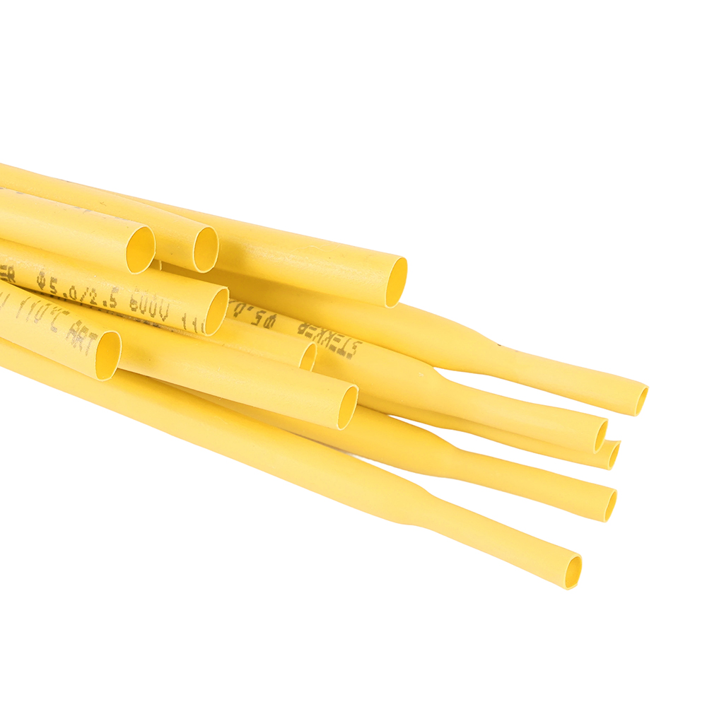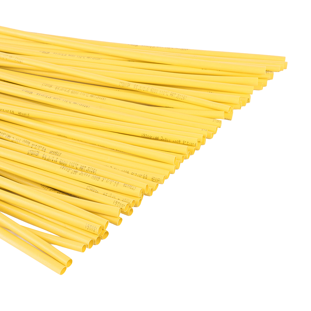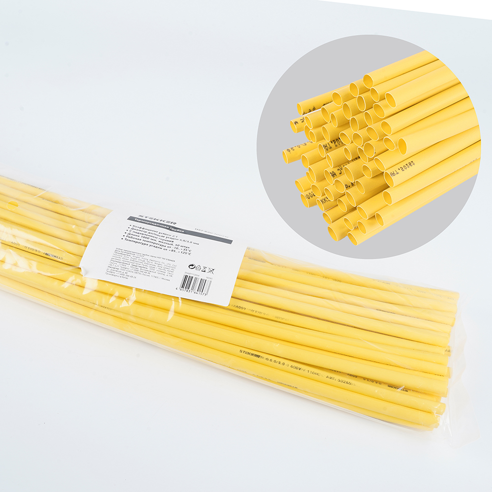 Термоусадочные трубки STEKKER HST-630-100YW, длина 1000мм. 50шт. в наборе, цвет: желтый. Коэффициент усадки 2:1, диапазон рабочих температур -10..+35°C, температура усадки +85..+125°C, номинальный ток 32А, для проводов сечением мм2.