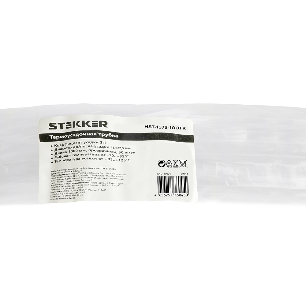 Термоусадочные трубки STEKKER HST-1575-100TR, длина 1000мм. 50шт. в наборе, цвет: прозрачный. Коэффициент усадки 2:1, диапазон рабочих температур -10..+35°C, температура усадки +85..+125°C, номинальный ток 32А, для проводов сечением мм2.
