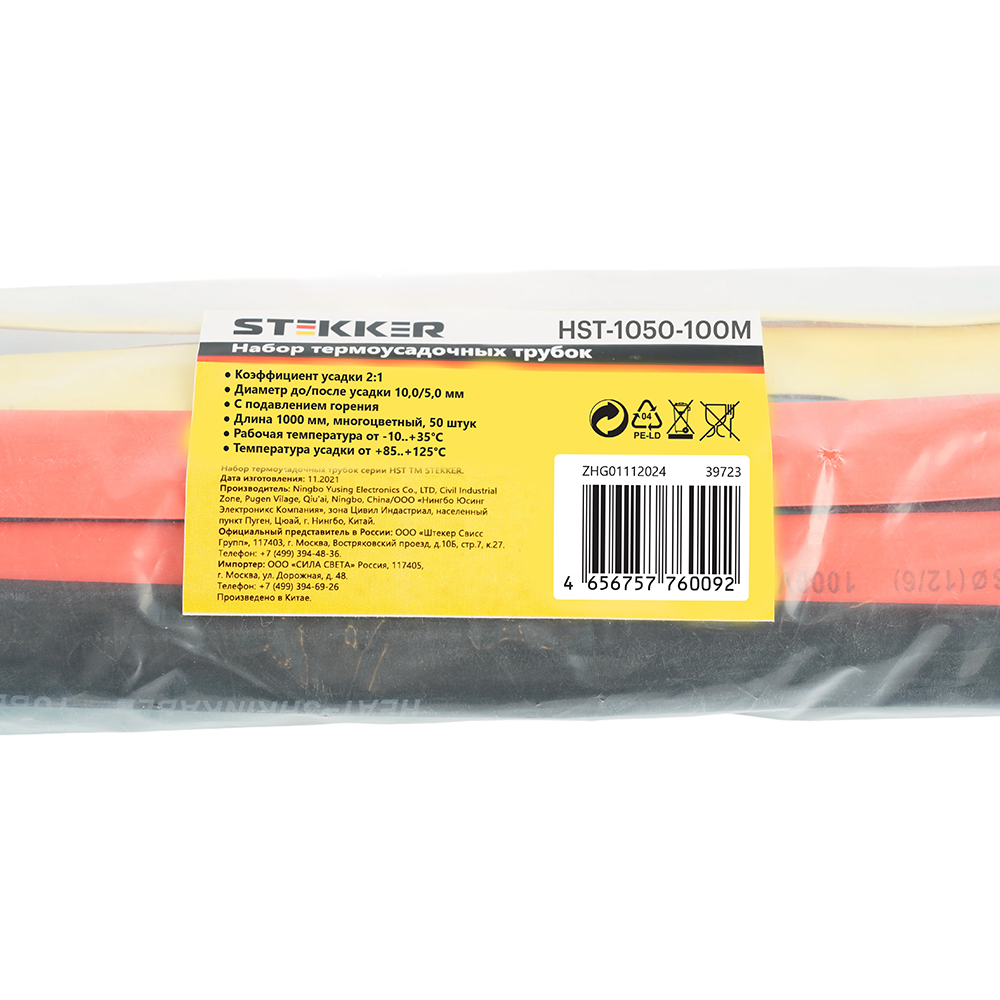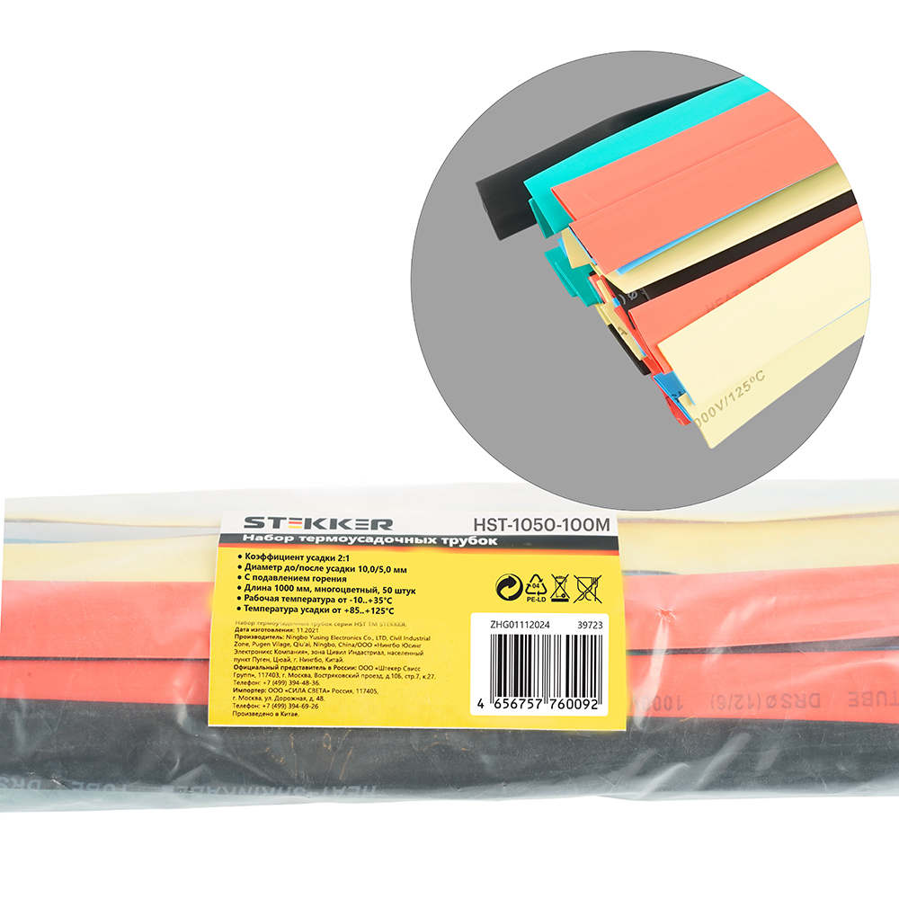 Термоусадочные трубки STEKKER HST-1050-100M, длина 1000мм. 50шт. в наборе, цвет: многоцветный . Коэффициент усадки 2:1, диапазон рабочих температур -10..+35°C, температура усадки +85..+125°C, номинальный ток 32А, для проводов сечением мм2.