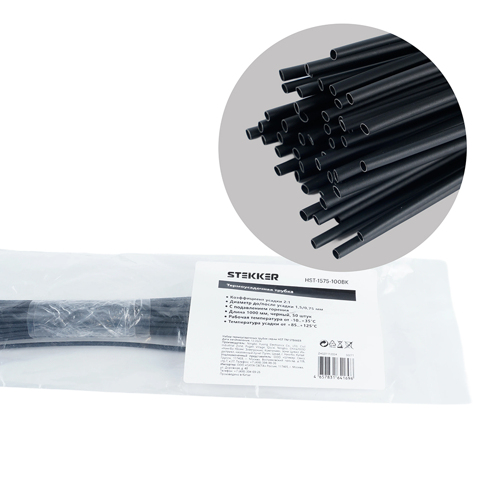 Термоусадочные трубки STEKKER HST-1575-100BK, длина 1000мм. 50шт. в наборе, цвет: черный. Коэффициент усадки 2:1, диапазон рабочих температур -10..+35°C, температура усадки +85..+125°C, номинальный ток 32А, для проводов сечением мм2.