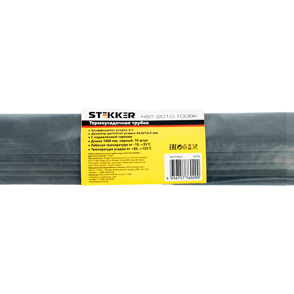 Термоусадочные трубки STEKKER HST-2512-100BK, длина 1000мм. 10шт. в наборе, цвет: черный. Коэффициент усадки 2:1, диапазон рабочих температур -10..+35°C, температура усадки +85..+125°C, номинальный ток 32А, для проводов сечением мм2.