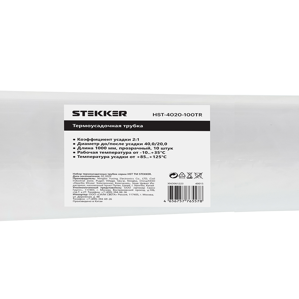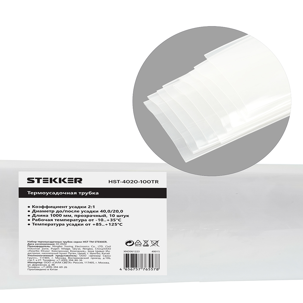 Термоусадочные трубки STEKKER HST-4020-100TR, длина 1000мм. 10шт. в наборе, цвет: прозрачный. Коэффициент усадки 2:1, диапазон рабочих температур -10..+35°C, температура усадки +85..+125°C, номинальный ток 32А, для проводов сечением мм2.