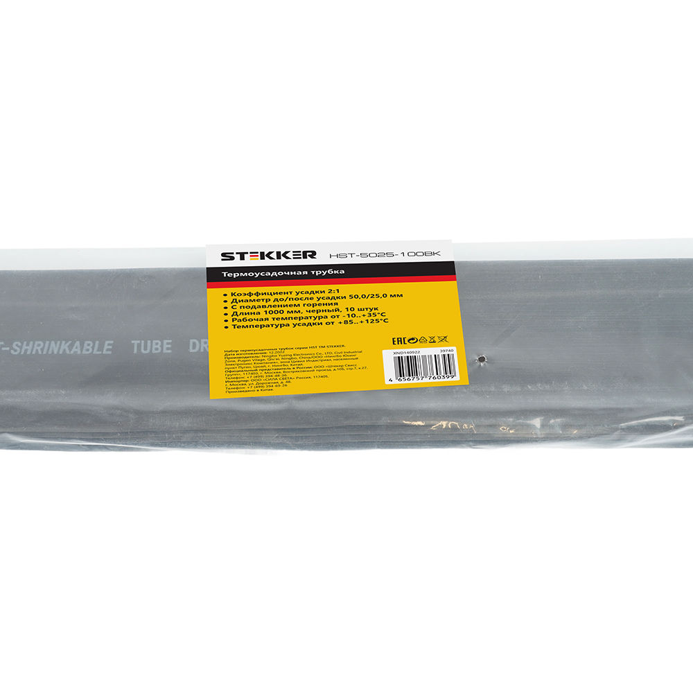 Термоусадочные трубки STEKKER HST-5025-100BK, длина 1000мм. 10шт. в наборе, цвет: черный. Коэффициент усадки 2:1, диапазон рабочих температур -10..+35°C, температура усадки +85..+125°C, номинальный ток 32А, для проводов сечением мм2.