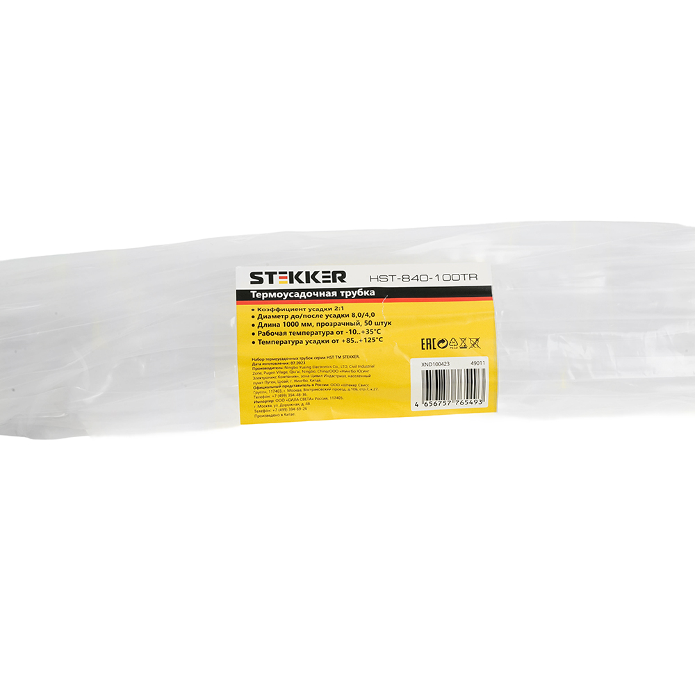 Термоусадочные трубки STEKKER HST-840-100TR, длина 1000мм. 50шт. в наборе, цвет: прозрачный. Коэффициент усадки 2:1, диапазон рабочих температур -10..+35°C, температура усадки +85..+125°C, номинальный ток 32А, для проводов сечением мм2.